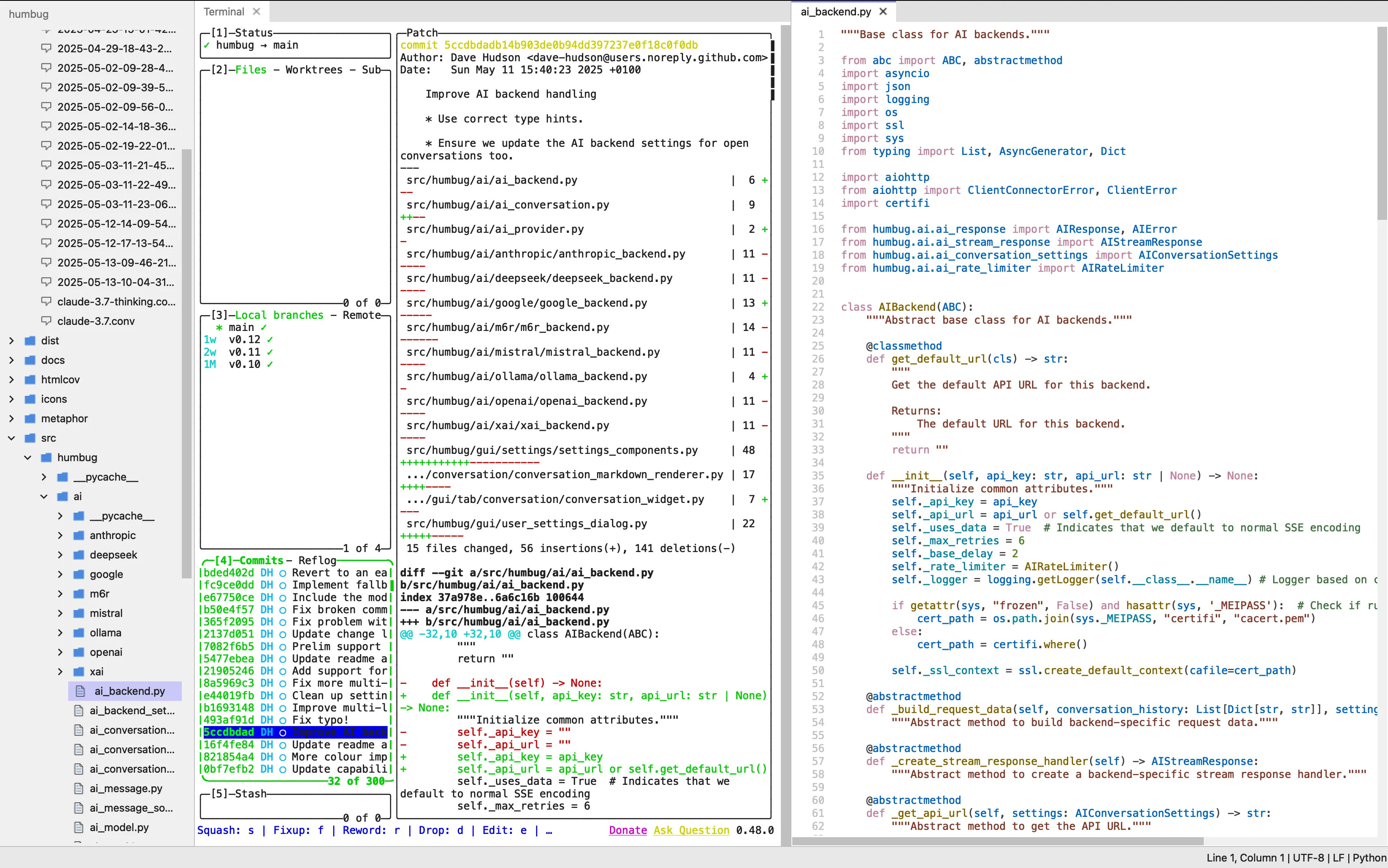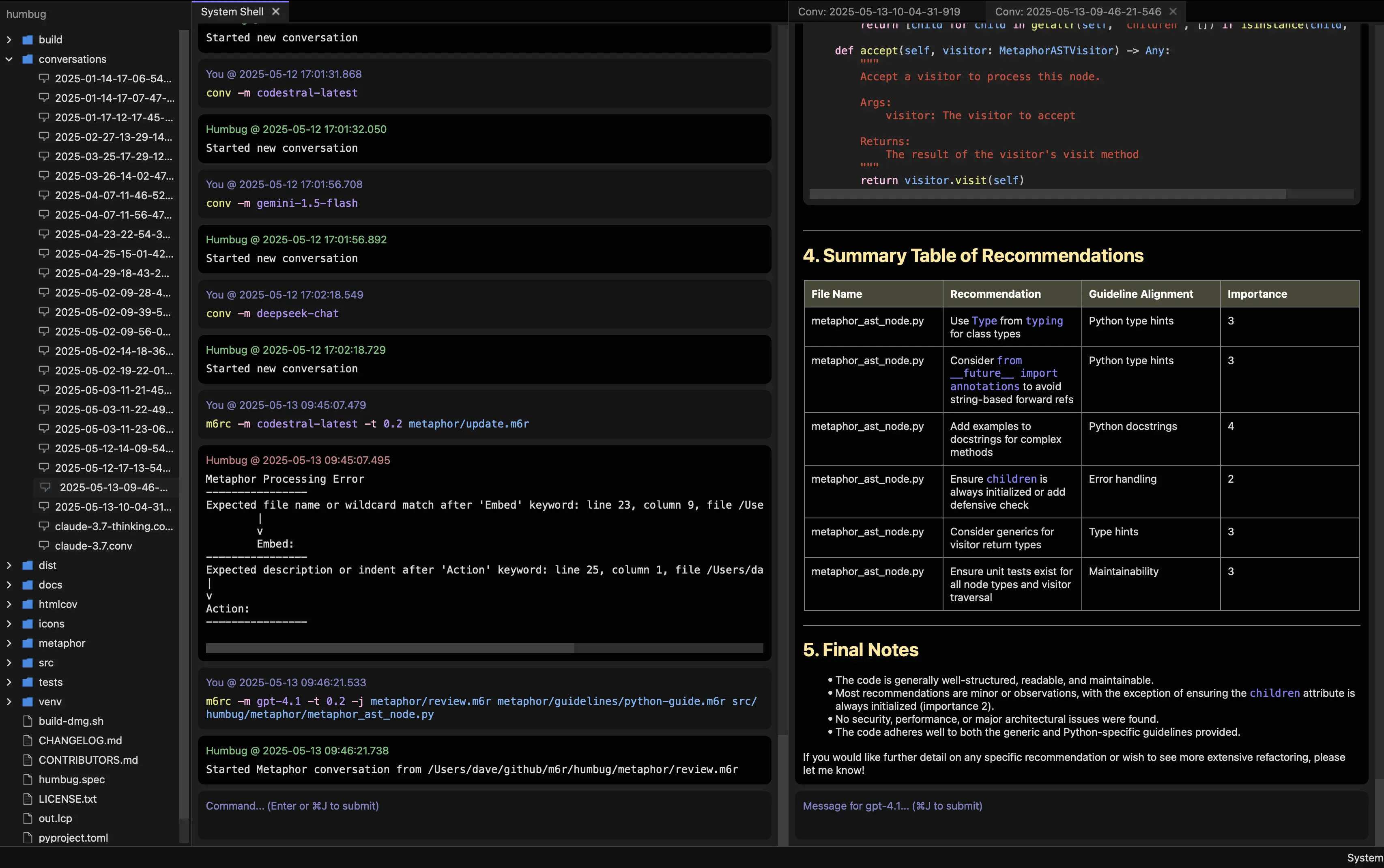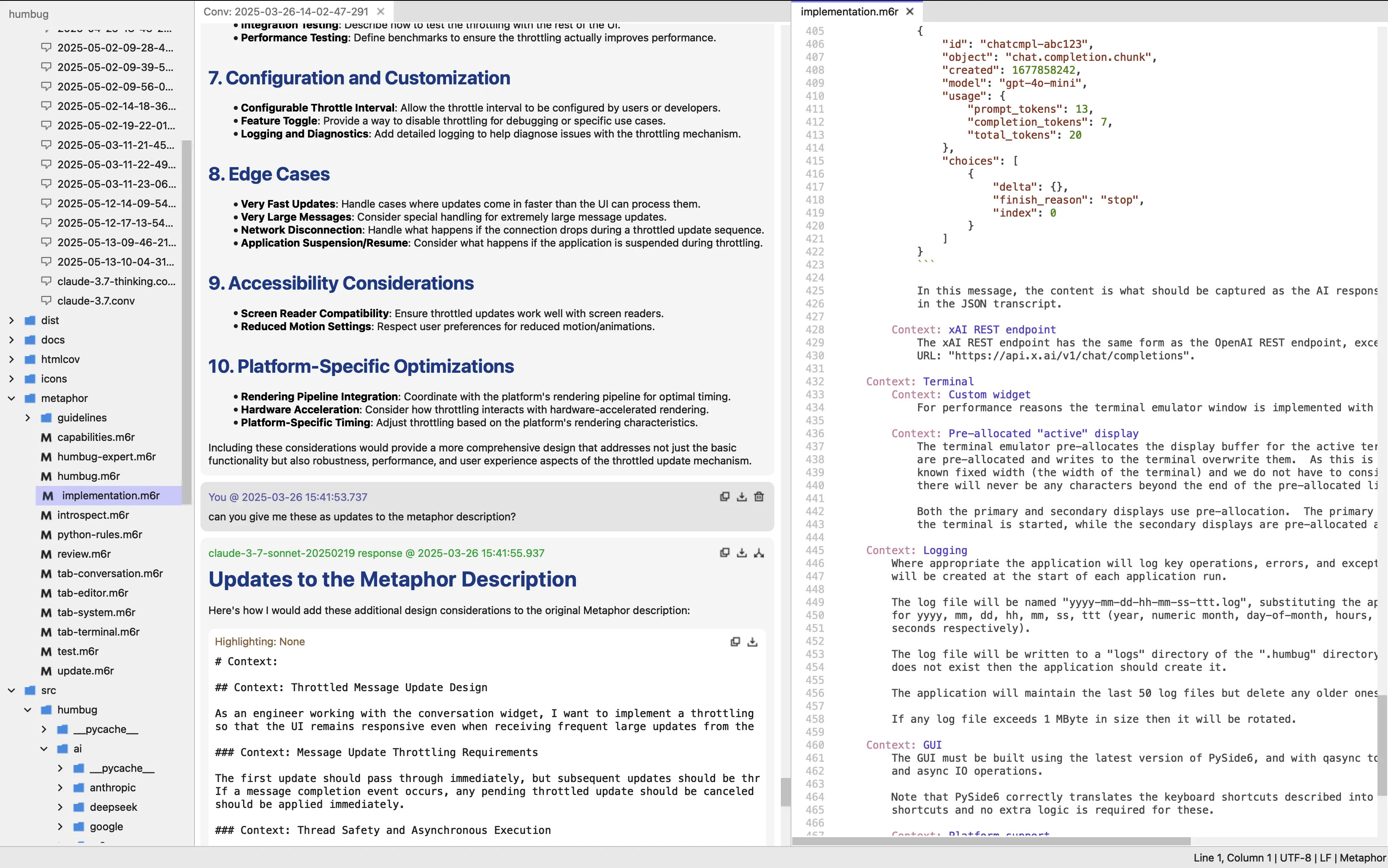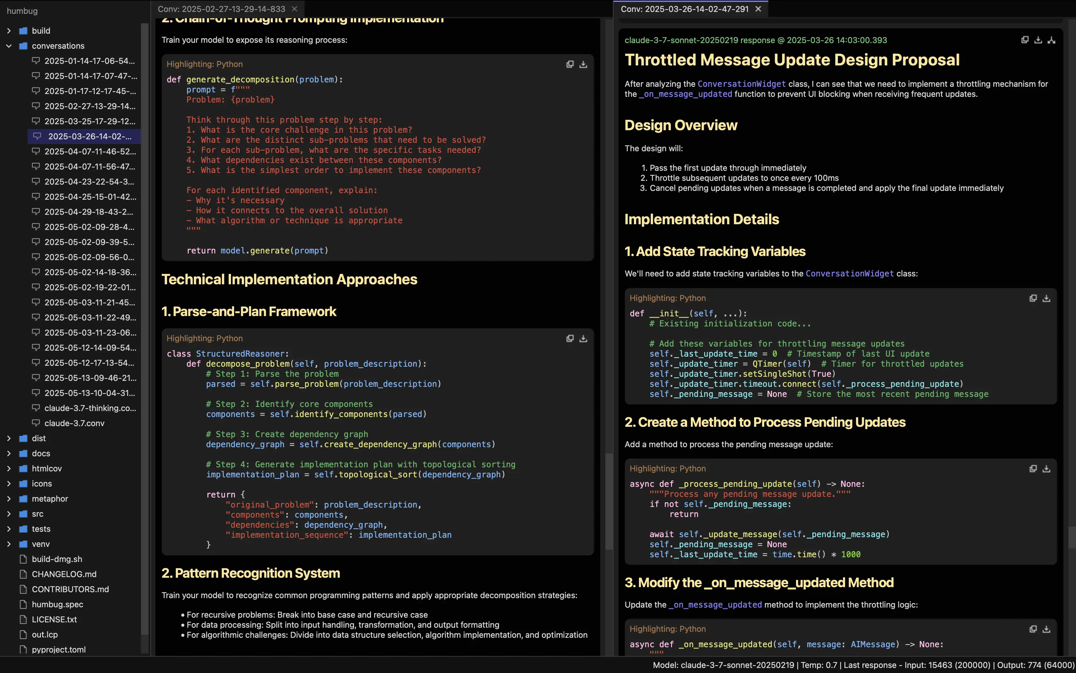 Humbug for Mac také umožňuje interakci s různými AI modely (Anthropic, DeepSeek, Google, Mistral, Ollama, OpenAI) a nechybí také přehledné zvýraznění syntaxe pro programovací jazyky jako jsou například C, C++, CSS, Go, HTML, Java, JavaScript, JSON, Python, Rust a mnoho dalších.