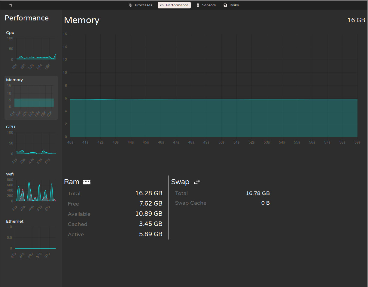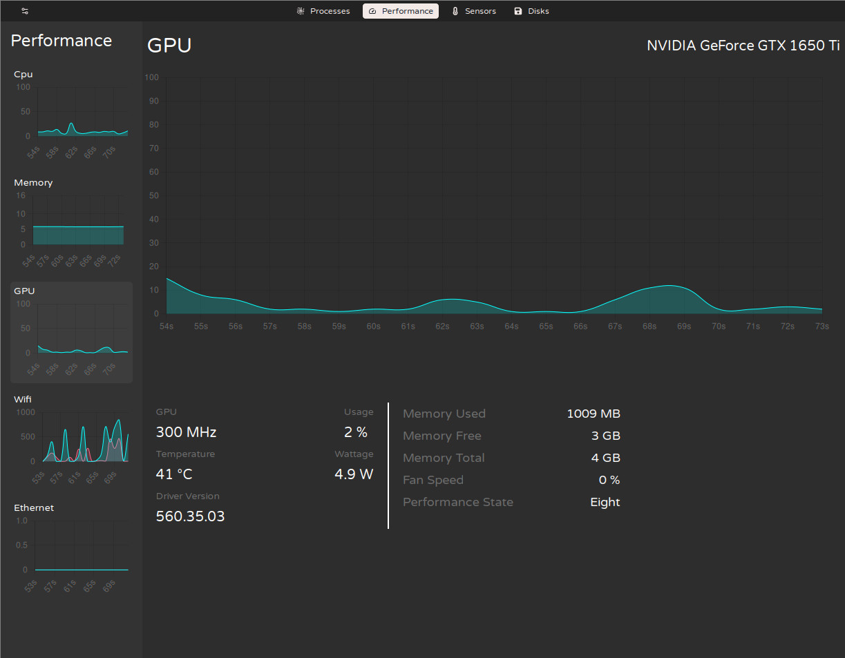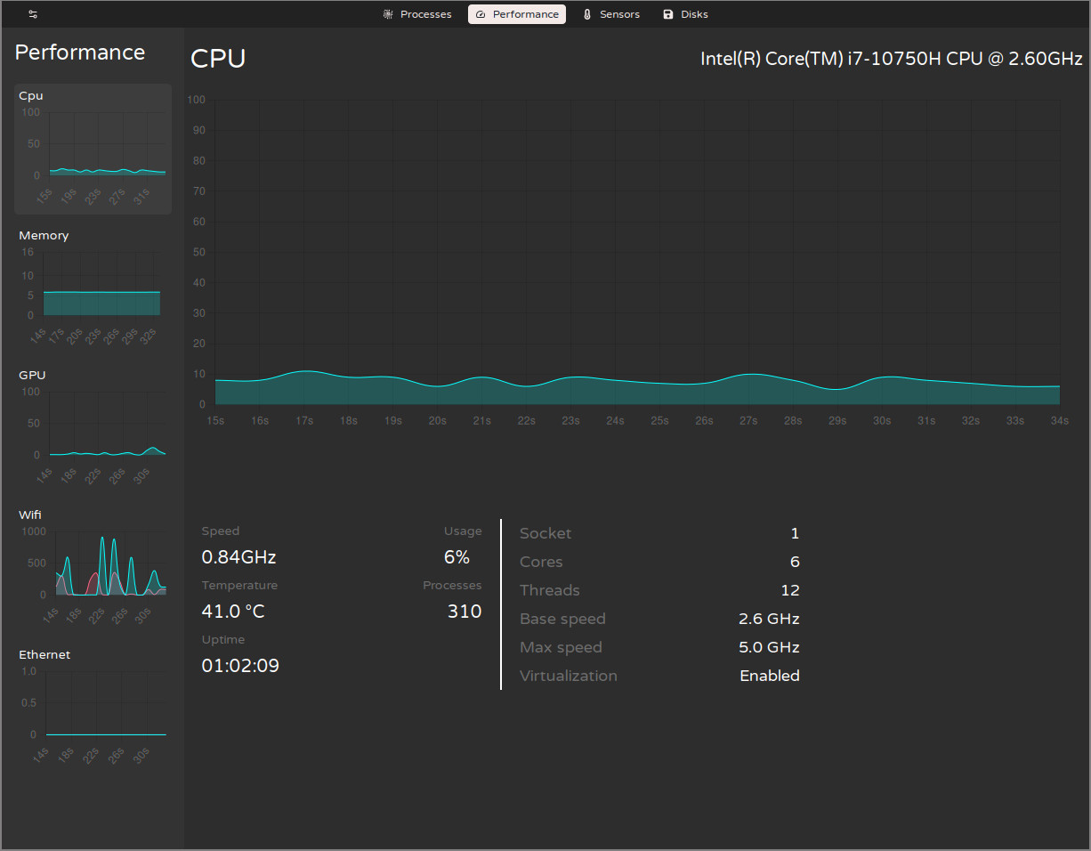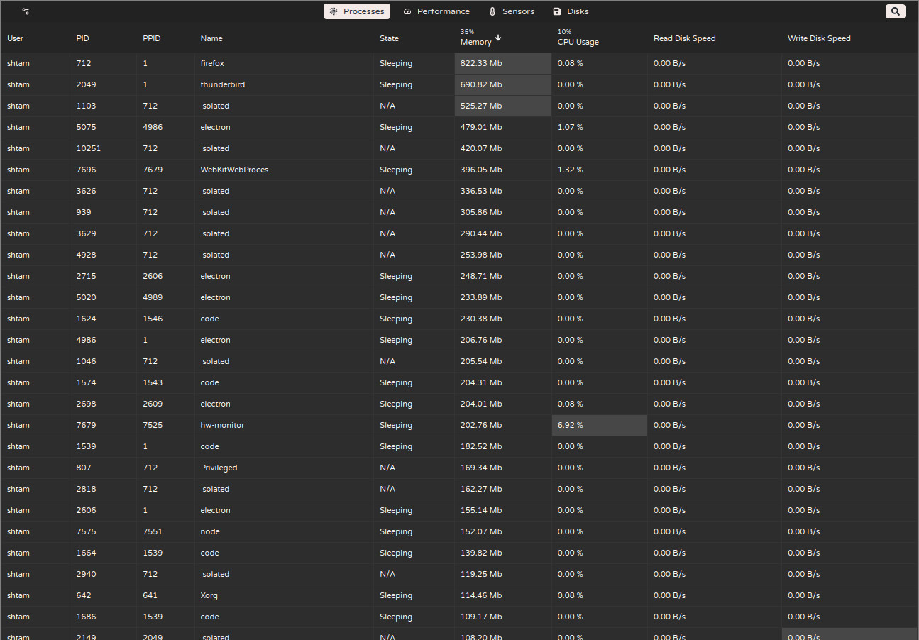 Jednotlivé procesy lze třídit a vyhledávat pro lepší přehlednost. Nabízí také přehledné grafické znázornění využití všech klíčových hardwarových komponent, včetně CPU, RAM a swap paměti, GPU a síťových karet. Zobrazeny jsou také aktuální teploty.