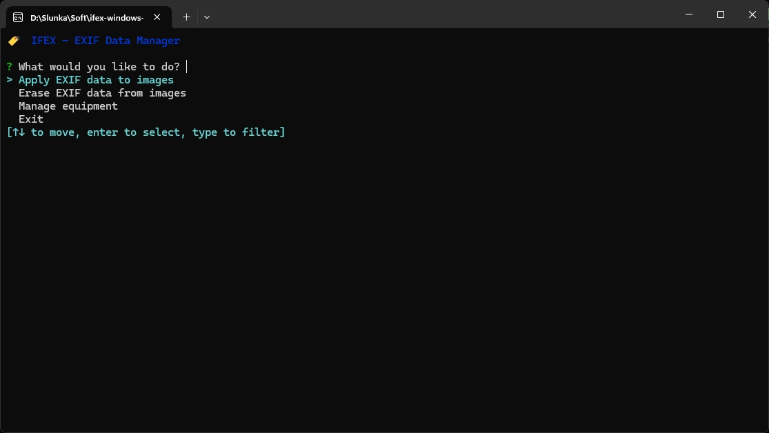 IFEX je pomocník, jehož pomocí provádět správu, tvorbu a úpravu EXIF metadat u digitálních snímků v oblasti příkazového řádku. Program pracuje s grafickými soubory typu JPG/JPEG, TIFF, DNG a mnoha RAW formáty. Provádět je možné i dávkové zpracování fotografií.