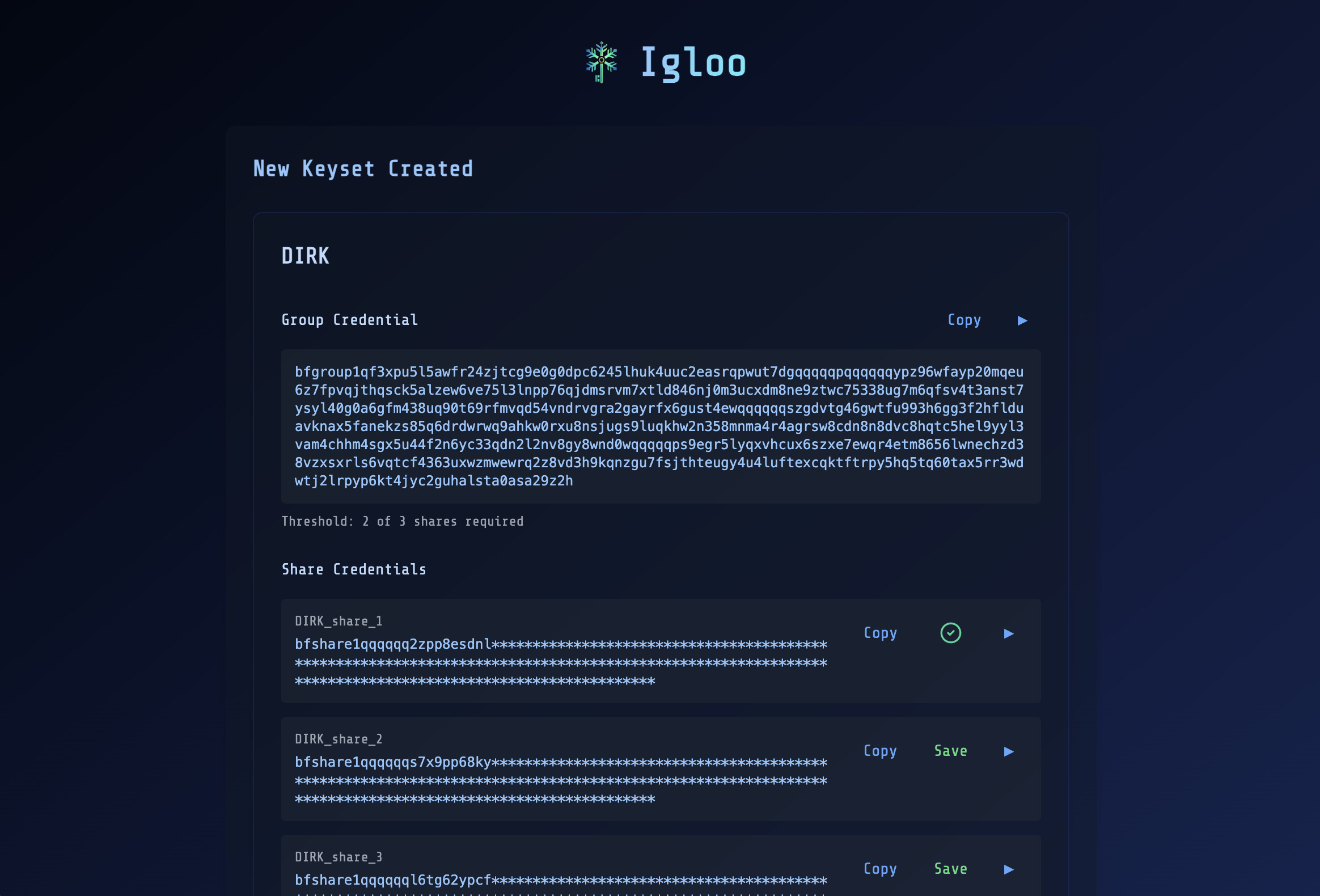 Igloo umožňuje generování nových nebo import stávajících privátníchklíčů. Podporuje režimy 2-z-3, 3-z-5 a další. Jednotlivé "shares" jsou chráněny heslem a uchovávány na disku. Program není potřeba instalovat.
