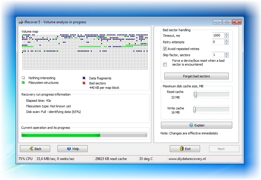 iRecover je profesionální nástroj pro obnovení a záchranu dat ztracených v důsledku pádu systému, nechtěným smazáním, formátováním, virovou nákazou apod. Program podporuje souborové systémy FAT, FAT32, NTFS a Linux Ext2, 3 a 4. Složky a soubory lze zachránit z klasických pevných disků, z USB disků, paměťových karet i z diskových polí RAID.
