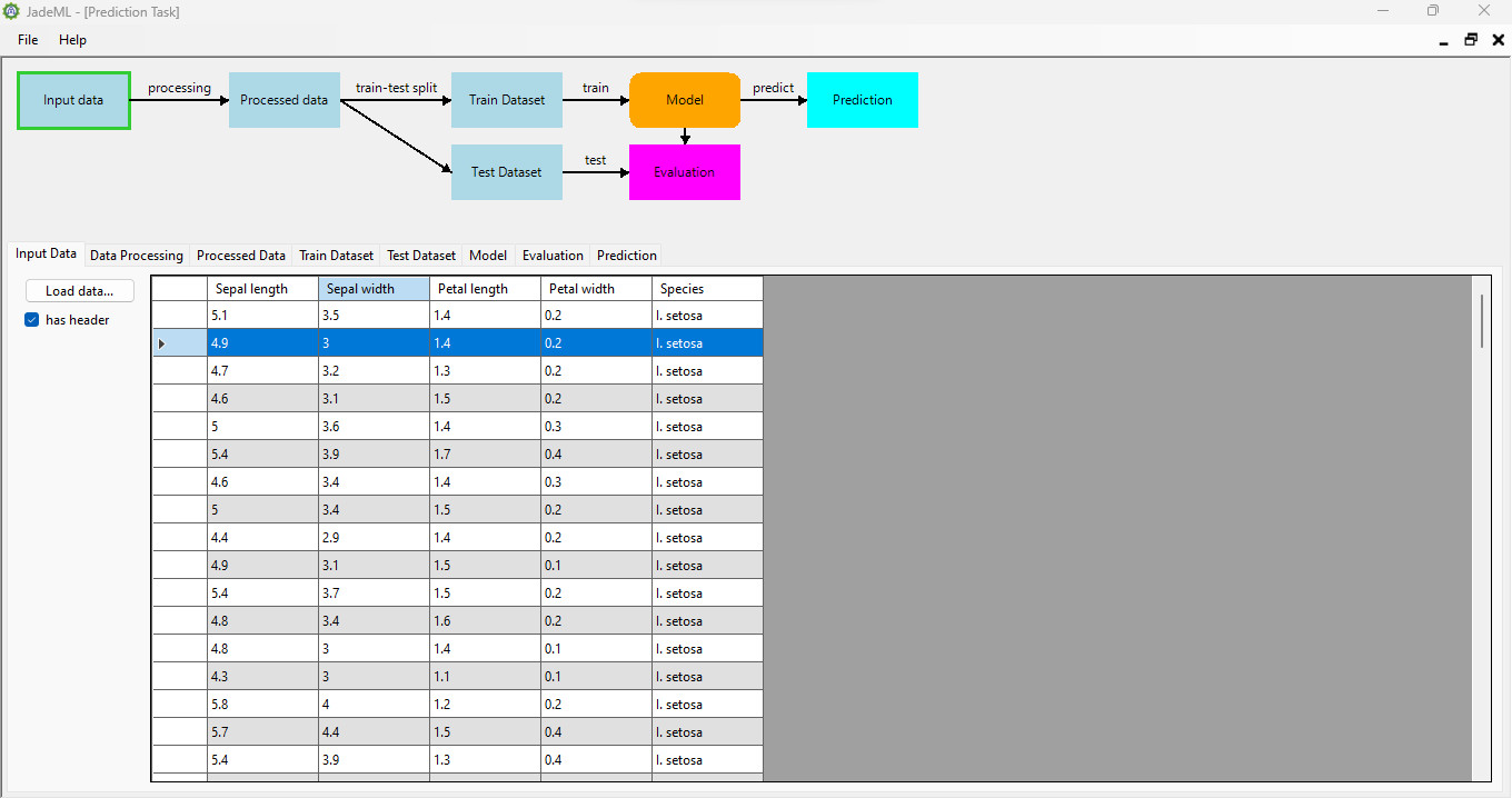 JadeML je grafické uživatelské rozhraní (GUI) pro jednoduché úlohy strojového učení (ML) ve Windows. Program nabízí přehledná prostředí s vývojovým diagramem zvlášť pro každou úlohu. Podporováno je spouštění i více úloho strojového učení najednou.