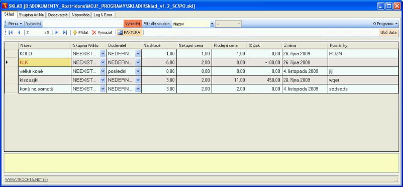 Program Jednoduchý sklad byl vytvořený za účelem uchovávání artiklů (položek) a jejich cen. Základním cílem bylo vytvořit uživatelsky příjemné prostředí s mnoha funkcemi ve vyhledávání a editací položek ve skladu. Program i zdrojové kódy napsané v jazyce C#, které si můžete stáhnout ze stránek výrobce. Program vyžaduje prostředí Microsoft .NET Framework 3.5 Program se skládá z tabulky. Tabulka nese následující informace o artiklu:ID artiklu, Název artiklu, počet kusů na skladě Nákupní cena, prodejní cena, % zisk, datum změny, skupiny artiuklu, dodavatele.