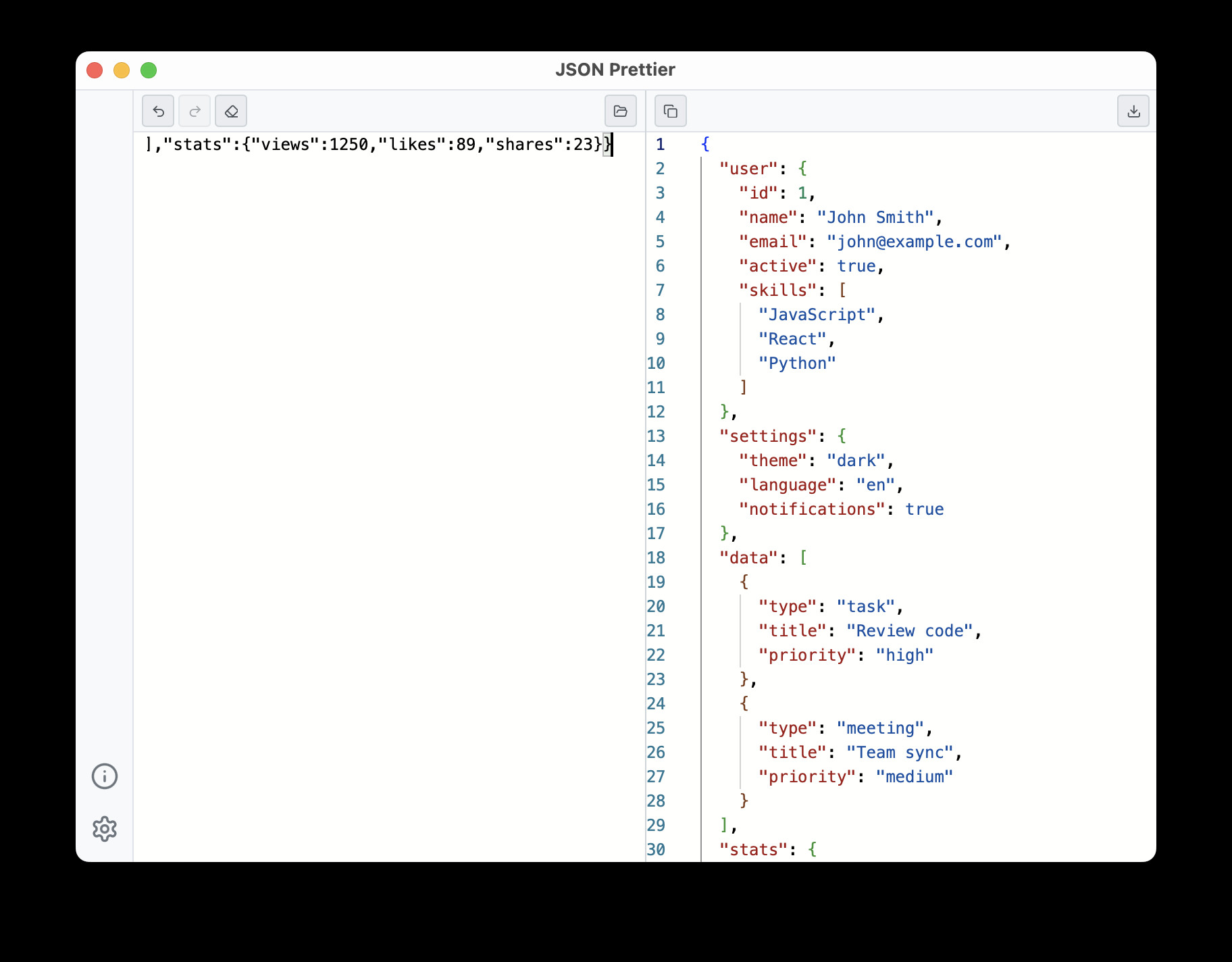 JSON Prettier je nástroj určený pro formátování, vizualizaci a přehlednější zobrazení dat uložených v JSON souborech. Nástroj umožňuje načítání, formátování a ukládání JSON souborů bez potřeby internetového připojení, což je ideální pro práci s citlivými daty. Samozřejmostí je přehledné zvýraznění syntaxe JSON souborů.
