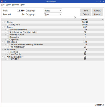 JWLManager je nástroj sloužící pro správu souborů typu JW Library (.jwlibrary, .jwlplaylist). Program dokáže prohlížet, mazat, upravovat i slučovat data přímo nebo prostřednictvím exportu a importu. Podporováno je také prohlížení a úprava osobních studijních dat, jako jsou například poznámky, záložky, oblíbené položky, zvýraznění a playlisty. Nechybí ani funkce pro odstranění nevyužitých záznamů a přeindexování tabulek v databázi.