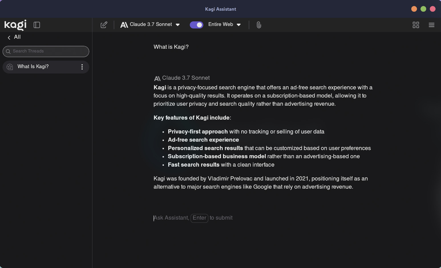 Kagi Assistant Desktop je uživatelské rozhraní pro pohodlný přístup k AI asistentovi Kagi. Program poskytuje přístup nejnovějším modelům LLM, jako jsou například OpenAI, Anthropic, Google a další.