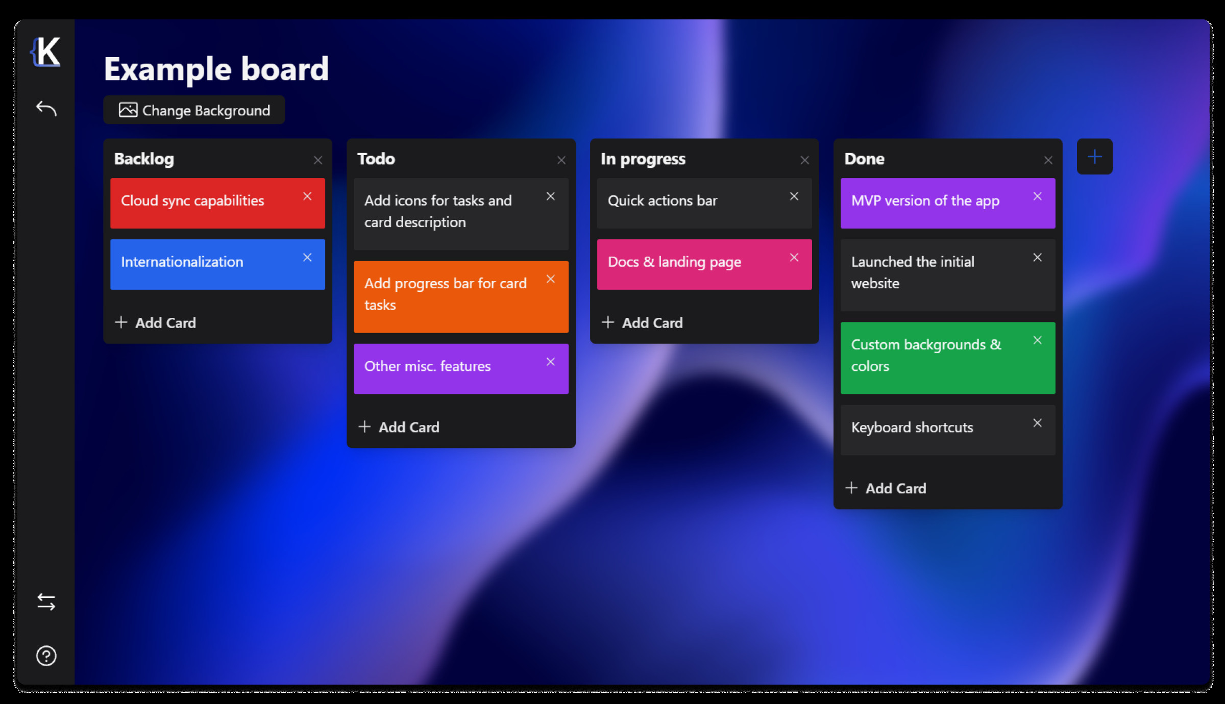 Kanri je nástroj, který slouží jako moderní Kanban tabule pro přehlednou evidenci a organizaci různých úkolů. Uživatel může snadno vytvářet nové úkoly a ty pak třídit do sloupců na základě aktuálního stavu dokončení (nový úkol, rozpracováno, hotovo). Vzhled programu lze upravit pomocí vlastních témat nebo barev karet. Veškerá data jsou uložena do lokálního JSON souboru.
