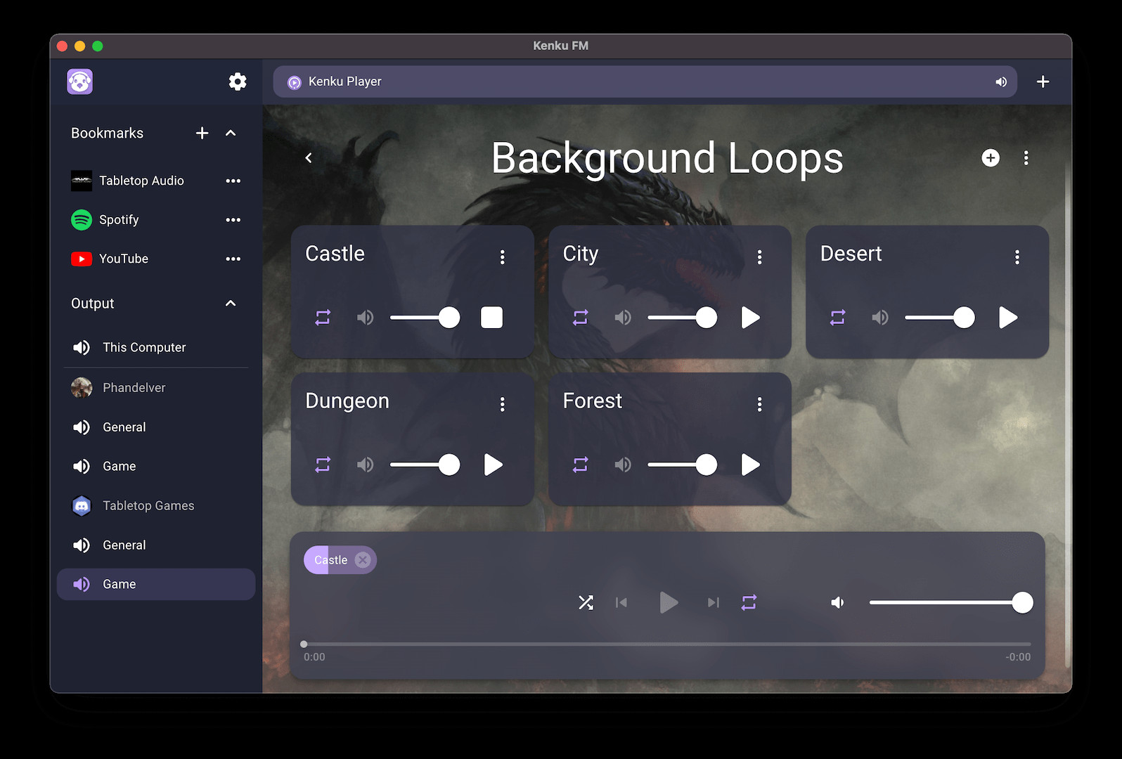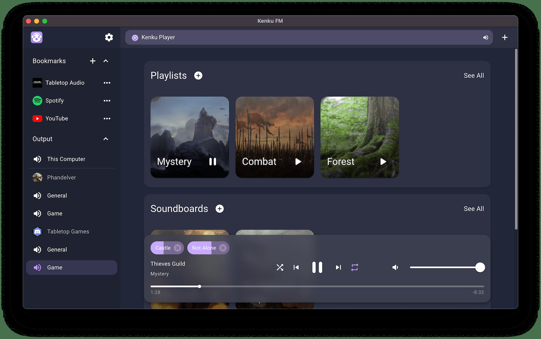 Kenku FM je aplikace sloužící pro sdílení hudby nebo různých audio efektů během hraní her a audio hovorů na Discordu. Nástroj dokáže přehrávat a sdílet zvuk z oblíbených webových stránek jako jsou například YouTube nebo Spotify. Podporovány jsou také virtuální audio vstupy, integrace se Stream Deck a posílání zvuku do více Discord serverů současně.