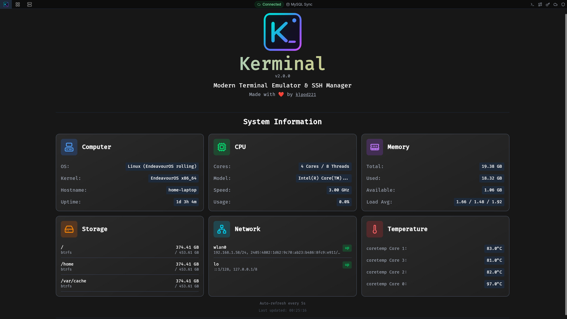 Kerminal je pokročilý a moderní terminálový emulátor a správce SSH, který v sobě kombinuje klasický lokální shell s pokročilým řízením SSH spojení. Pro vykreslení výstupu je využíván xterm.js s WebGL rendererem a Unicode 11 podporou, což umožňuje plynulé vykreslování i náročnějších výstupů.