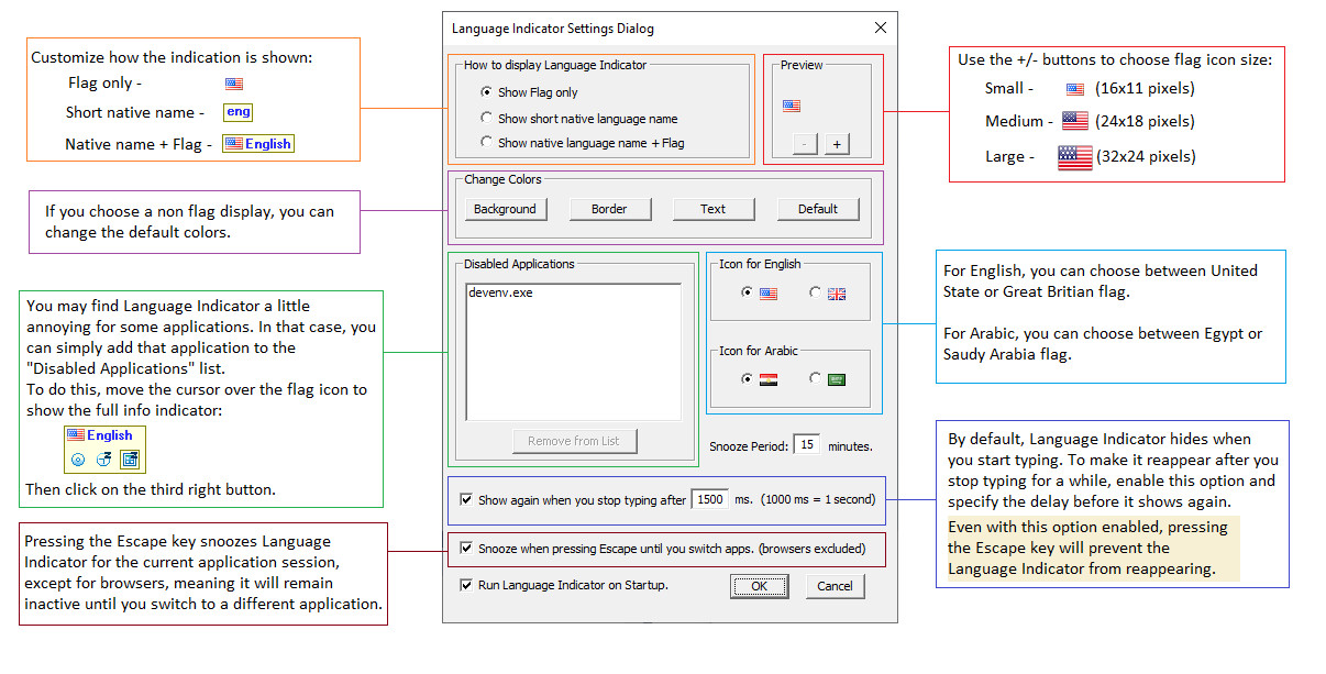 Language Indicator je nástroj, který indikuje aktuální jazykové rozložení klávesnice pomocí malé vlajky vedle kurzoru myši. Vlajka se zobrazí pokaždé při kliknutí do textového pole. Nástroj tak může předcházet nechtěným chybám při psaní způsobeným nesprávným jazykovým nastavením. Indikován je navíc i zapnutý Caps Lock.