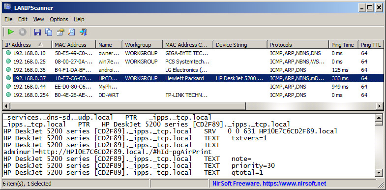 LANIPScanner je nenáročný pomocník pro prohledávání lokální sítě LAN a zobrazeních všech připojených počítačů a dalších zařízení. Pro prohledávání program využívá protokolů ICMP (ping), ARP, NBNS, SSDP, mDNS a DNS, takže dokáže zjistit i jinak skrytá zařízení.