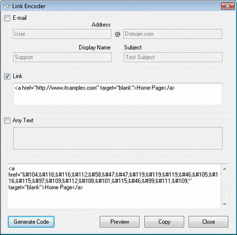 Link Encoder je užitečná pomůcka pro ochranu e-malových adres a jiných odkazů na webových stránkách proti jejich zneužití při spamu apod. Ochrana e-mailů a odkazů probíhá pomocí kódování. Program není potřeba instalovat.