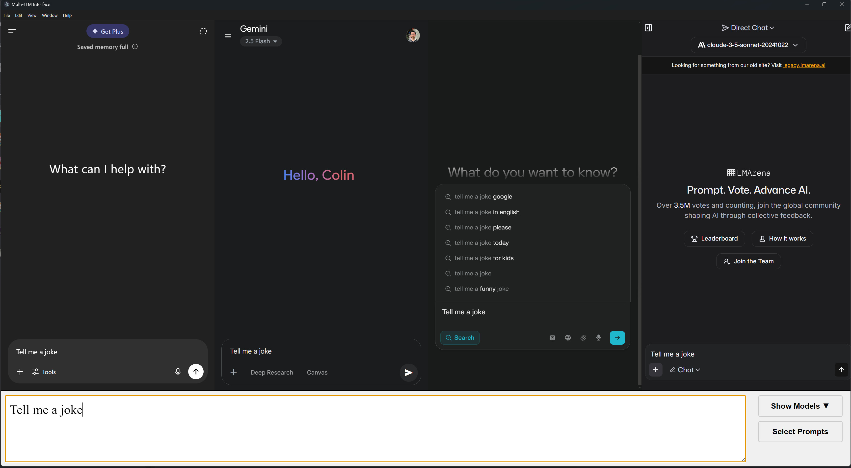 Každý LLM model je zobrazen jako vložený "webview" do Electron aplikace a nejsou vyžadovány API klíče, vše běží přes prohlížečovou vrstvu. Program nabízí vlastní výběr LLM, ale přidával lze i další modely.