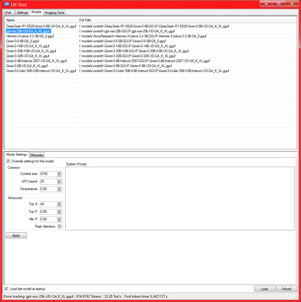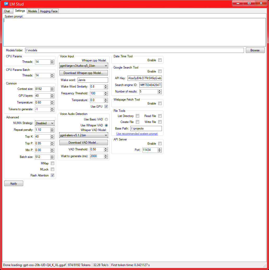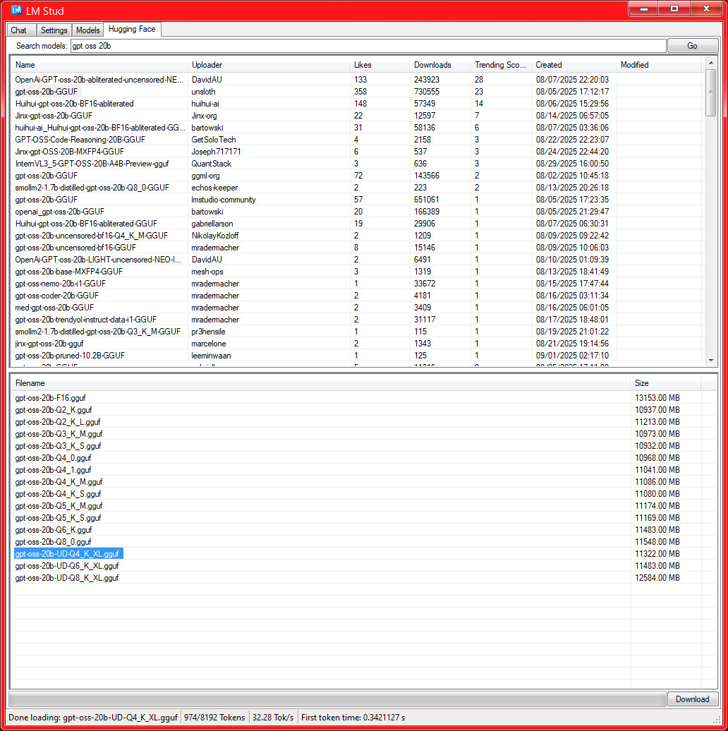 LM Stud je klient, který dokáže lokálně spustit a snadno používat lokální LLM modely llama.cpp a whisper.cpp. Nástroj zobrazuje tzv. thinking stream, díky němuž lze snadno zobrazit, jak model generuje odpověď po jednotlivých částech. Součástí je vestavěné Google vyhledávání a volitelný hlasový stup a výstup či integrace Hugging Face.