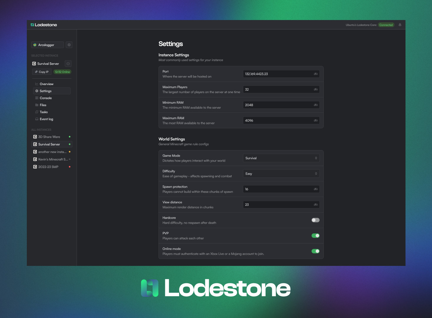 Lodestone je nástroj umožňující hosting serverů pro Minecraft i další multiplayer hry. Program aktuální stav serveru pro efektivní monitorování. Program nabízí funkce jako rozbalování archivů, nahrávání, stahování a správa souborů. Podporována je také týmová spolupráce a správa uživatelských práv. Úprava a rozšíření funkcí je také možná pomocí maker.