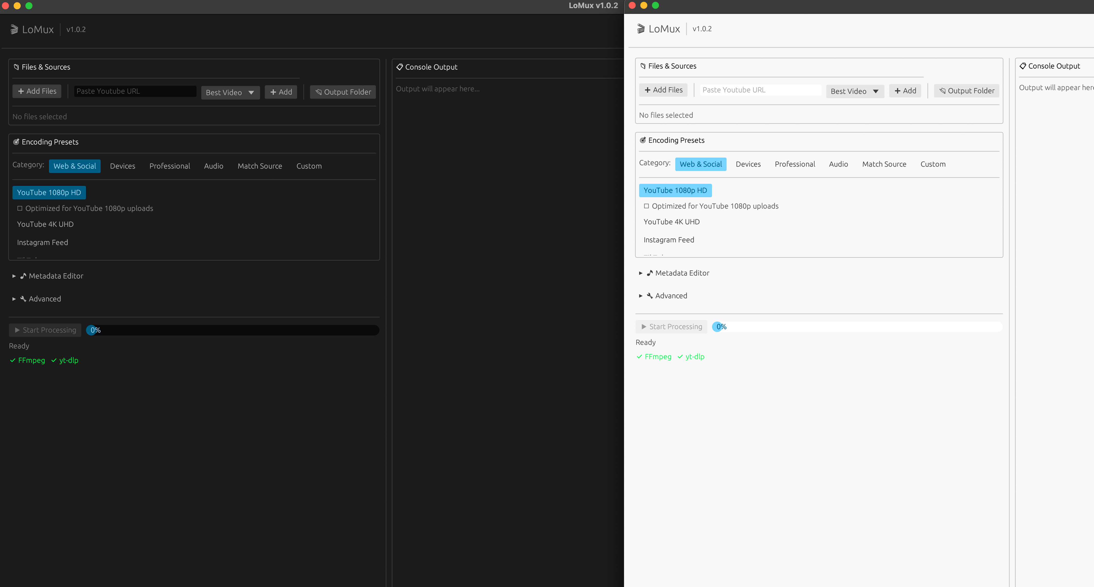 LoMux je nástroj, který slouží v podstatě jako přehledné rozraní pro nástroje ffmep a yt-dlp a který slouží pro stahování z YouTube a pro vzájemnou konverzi stažených videí. Samozřejmostí je podpora různé kvality i formátů multimediálních souborů a nechybí ani možnost dávkového zpracování a editace metadat. Celý proces konverze lze zobrazit a také ukládat do LOG souborů.
