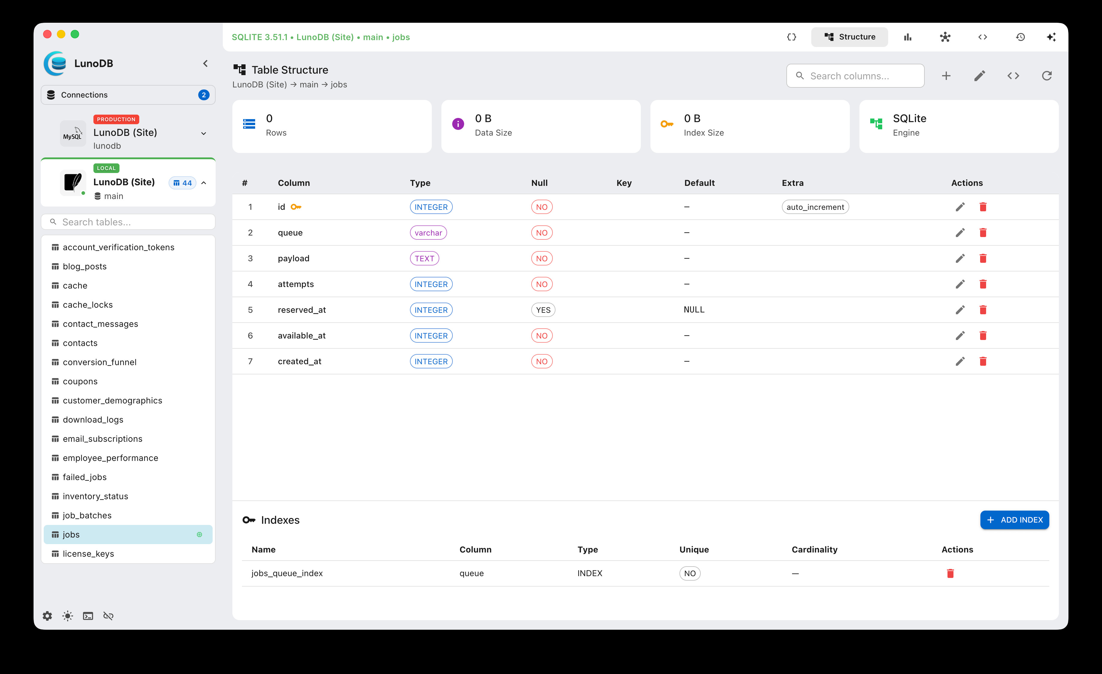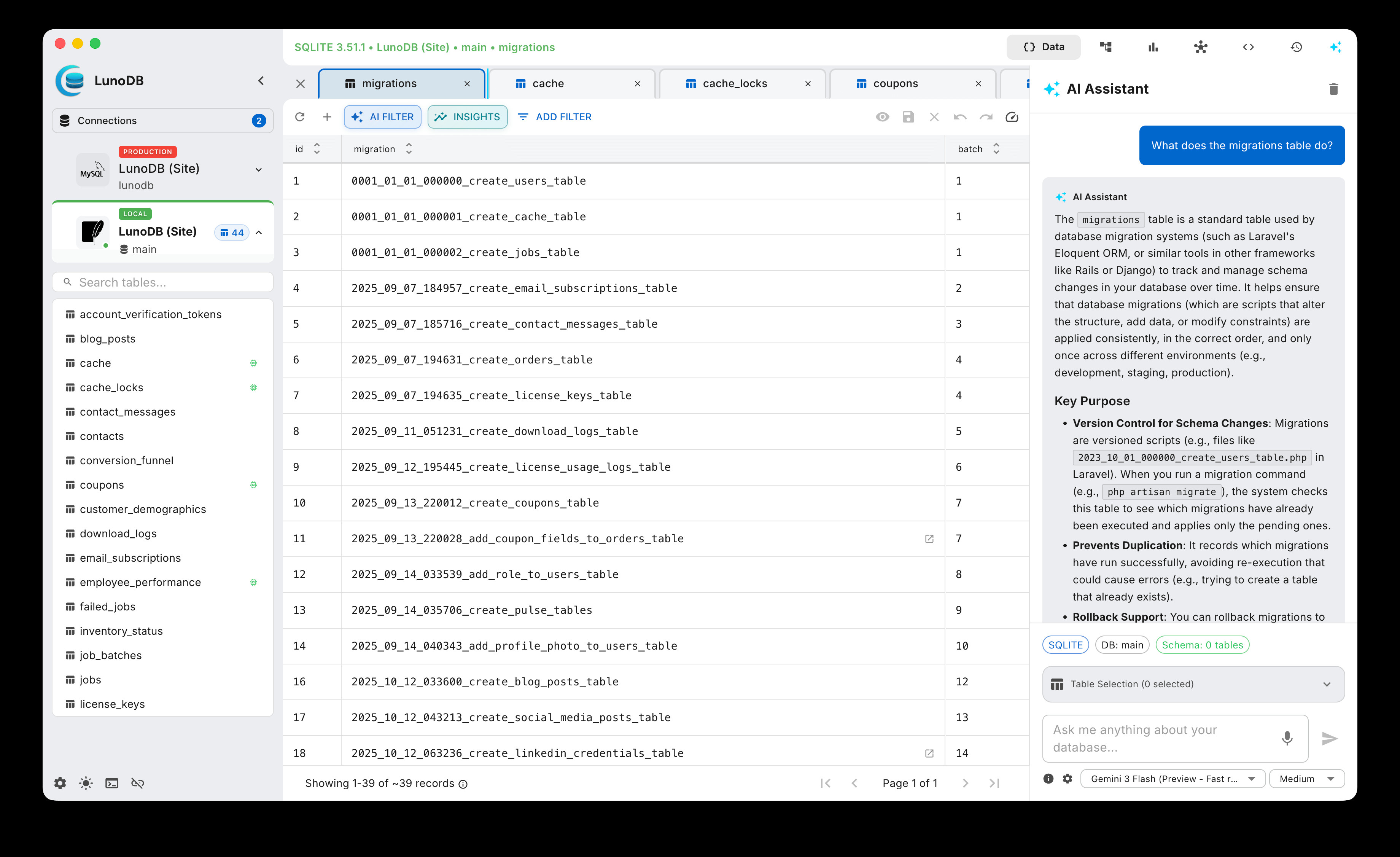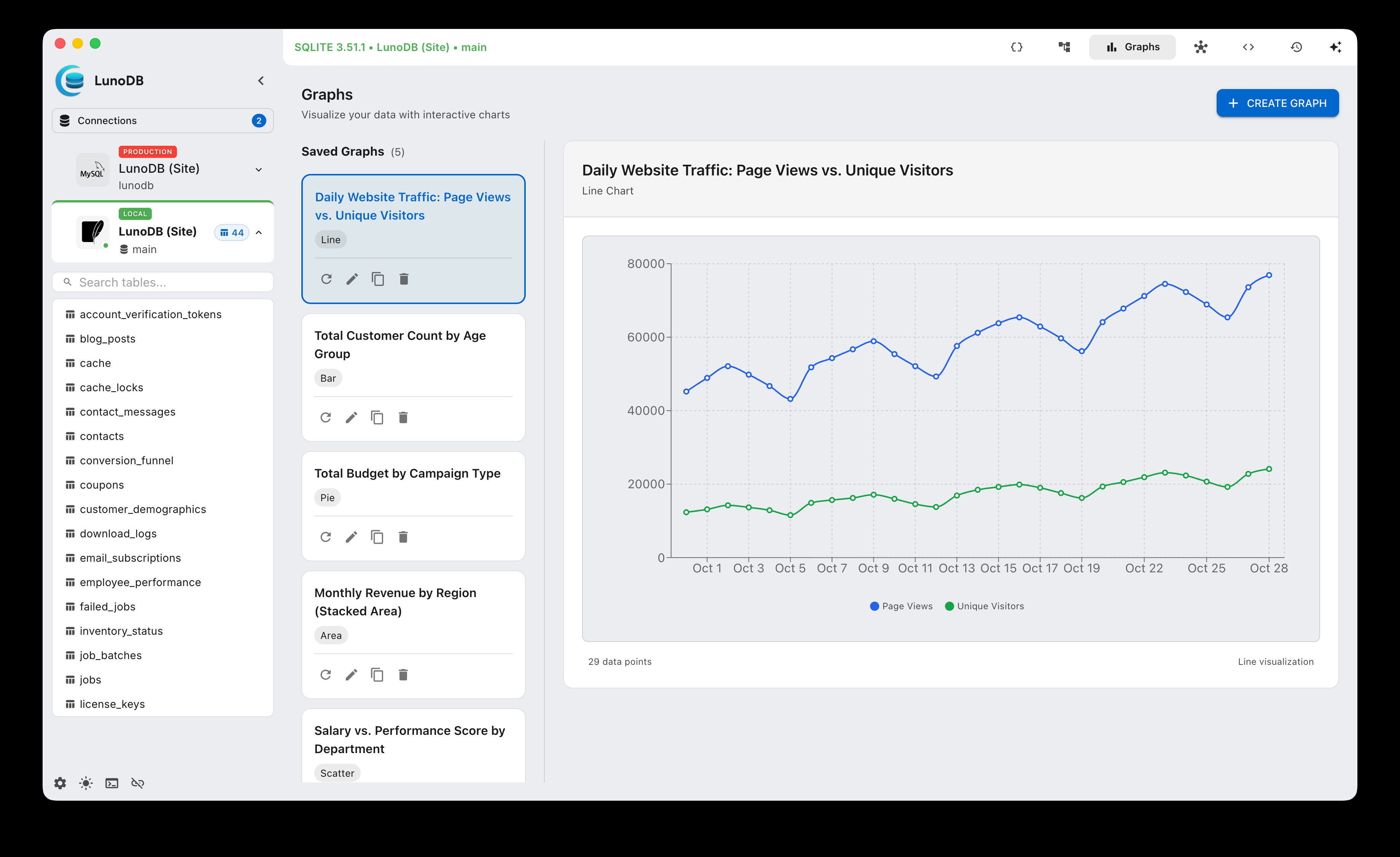 LunoDB je výkonný a profesionální databázový nástroj s vestavěnou AI asistencí, který umožňuje pracovat s databázemi prostřednictvím přirozeného jazyka a okamžitě generovat SQL dotazy. Podporovány jsou databáze typu MySQL, PostgreSQL, SQLite, MongoDB, Redis, MariaDB, SQL Server a mnoho dalších.