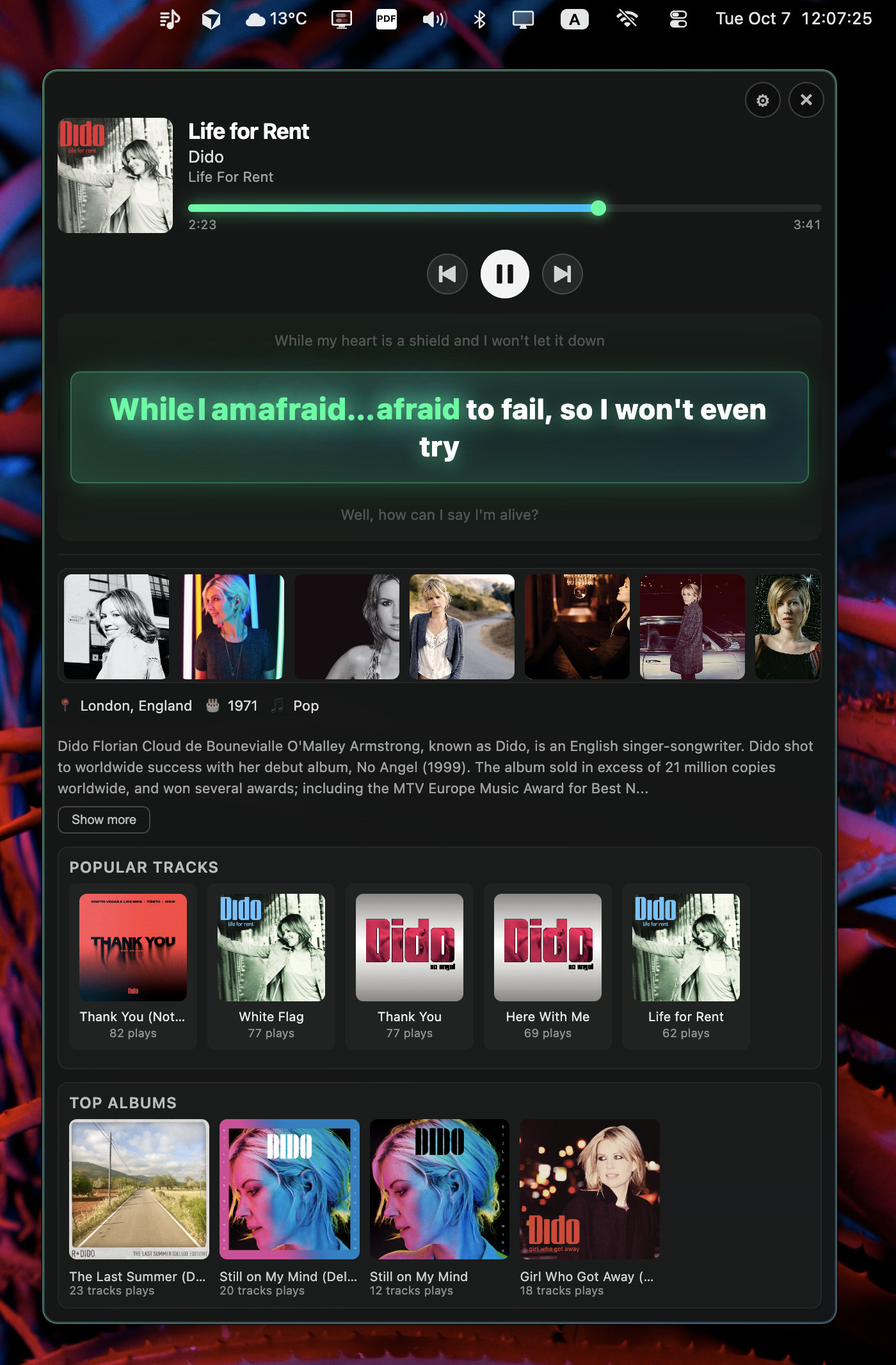 LyricGlow for Mac je aplikace sloužící pro zobrazení synchronizovaných textů písní u skladeb přehrávaných pomocí audio přehrávačů Spotify, Apple Music nebo YouTube Music. Zobrazen je také obrázek alba, informace o interpretovi i další metadata.