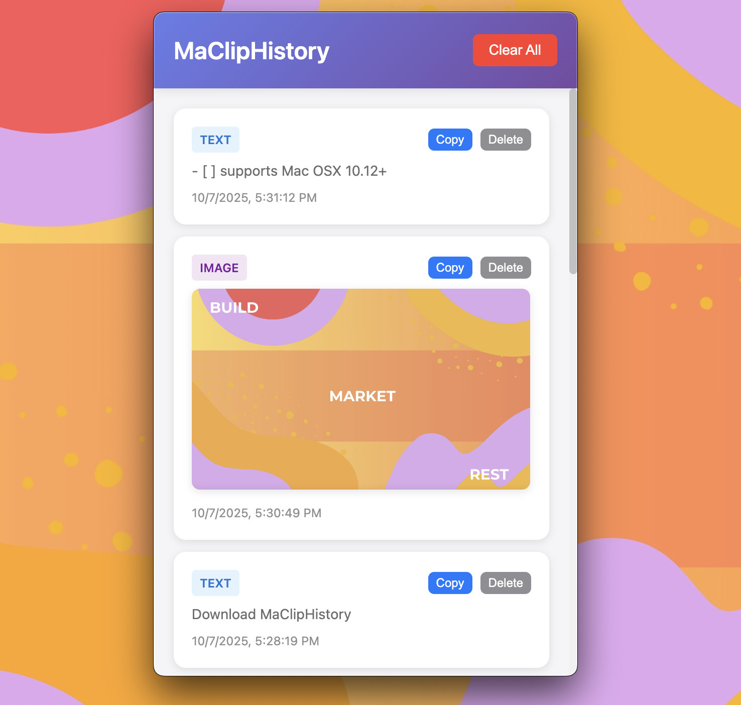 macliphistory for Mac je nástroj sloužící pro přehlednou a prohlížení historie kopírovaných položek do schránky (clipboardu) v počítačích s macOS. Ukládat lze historii kopírovaných obrázků, textu, URL odkazů apod. a mezi těmito položkami lze snadno vyhledávat. Všechny kopírované položky zůstávají zachované mezi relacemi, tj. jsou uloženy trvale.
