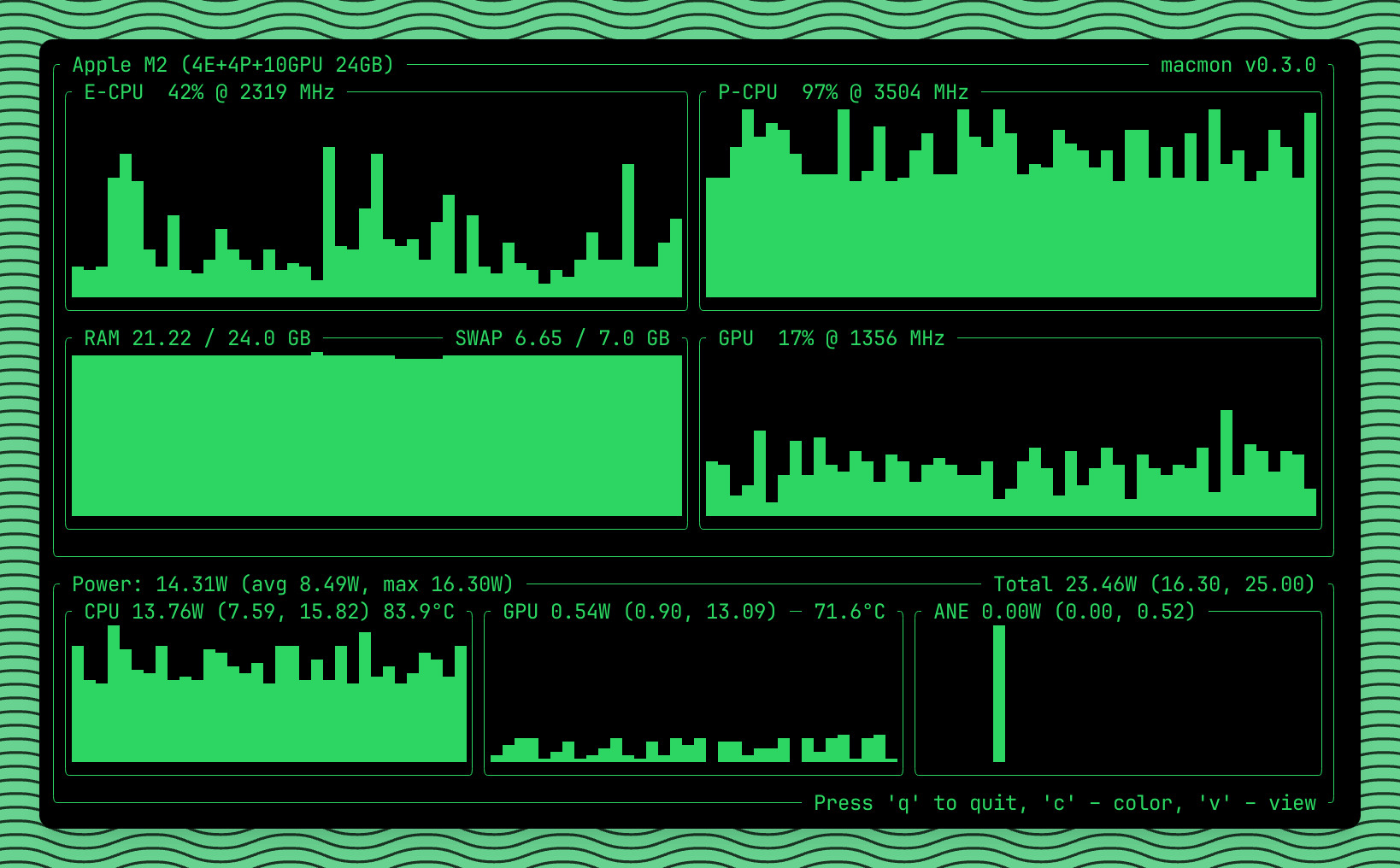 macmon je aplikace ovládaná pomocí příkazového řádku a sloužící pro monitorování výkonu počítačů s macOS a procesorem Apple Silicon. Sledovat lze výkon CPU, GPU, využití RAM, spotřebu energie a teplotu. Uživatel má pak k dispozici přehledné grafické využití všech těchto prostředků.