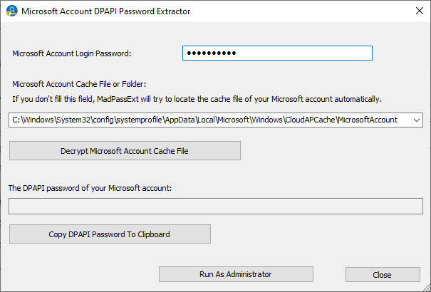 MadPassExt je nenáročný nástroj sloužící pro dešifrování a extrakci DPAPI hesla vygenerovaného pro účet Microsoft. Pomocí tohoto hesla je pak možné obnovit hesla zašifrovaná pomocí DPAPI z externího pevného disku. Program se nemusí instalovat.