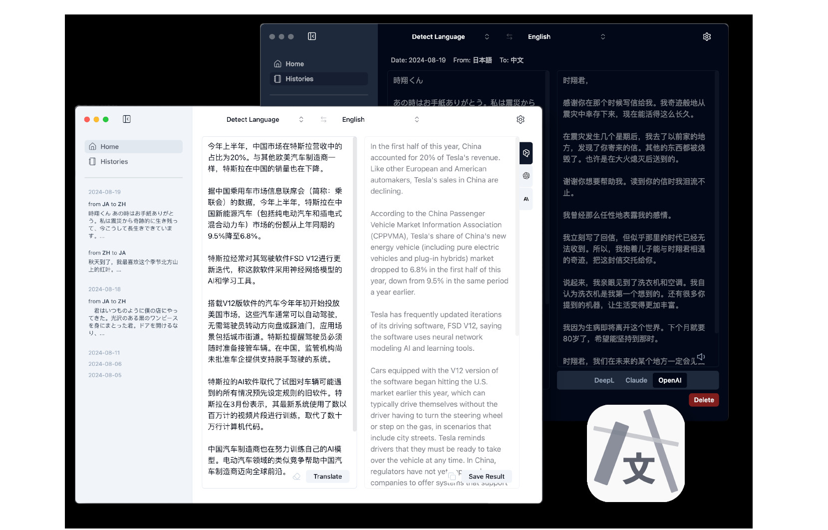 MAI Translator je nástroj pro kompletní překlad cizojazyčných textů s pomocí překladových služeb umělé inteligence (AI). Program dokáže překládat texty za pomocí služeb jako jsou například DeepL, Claude nebo OpenAI. Nabízí také lokální správu historie překladů, což usnadňuje přístup k předchozím překladům.