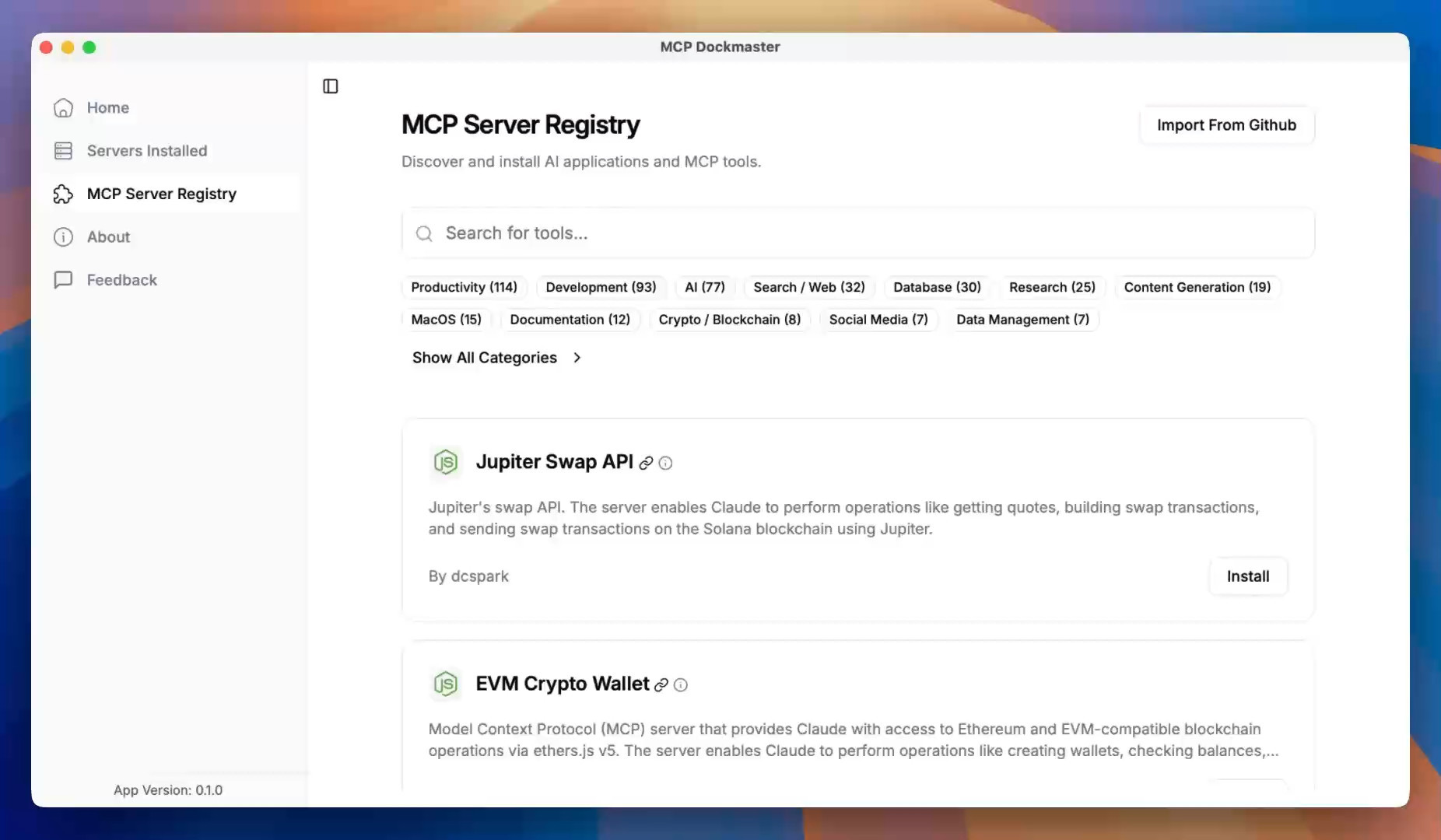 MCP Dockmaster je aplikace určená pro snadnou instalaci a přehlednou správu MCP serverů (Model Context Protocol). Tyto servery reagují na požadavky různých AI asistentů jako jsou například Claude, OpenAI, Cursor, Windsurf a dalších a poskytuje jim přístup k různým nástrojům.