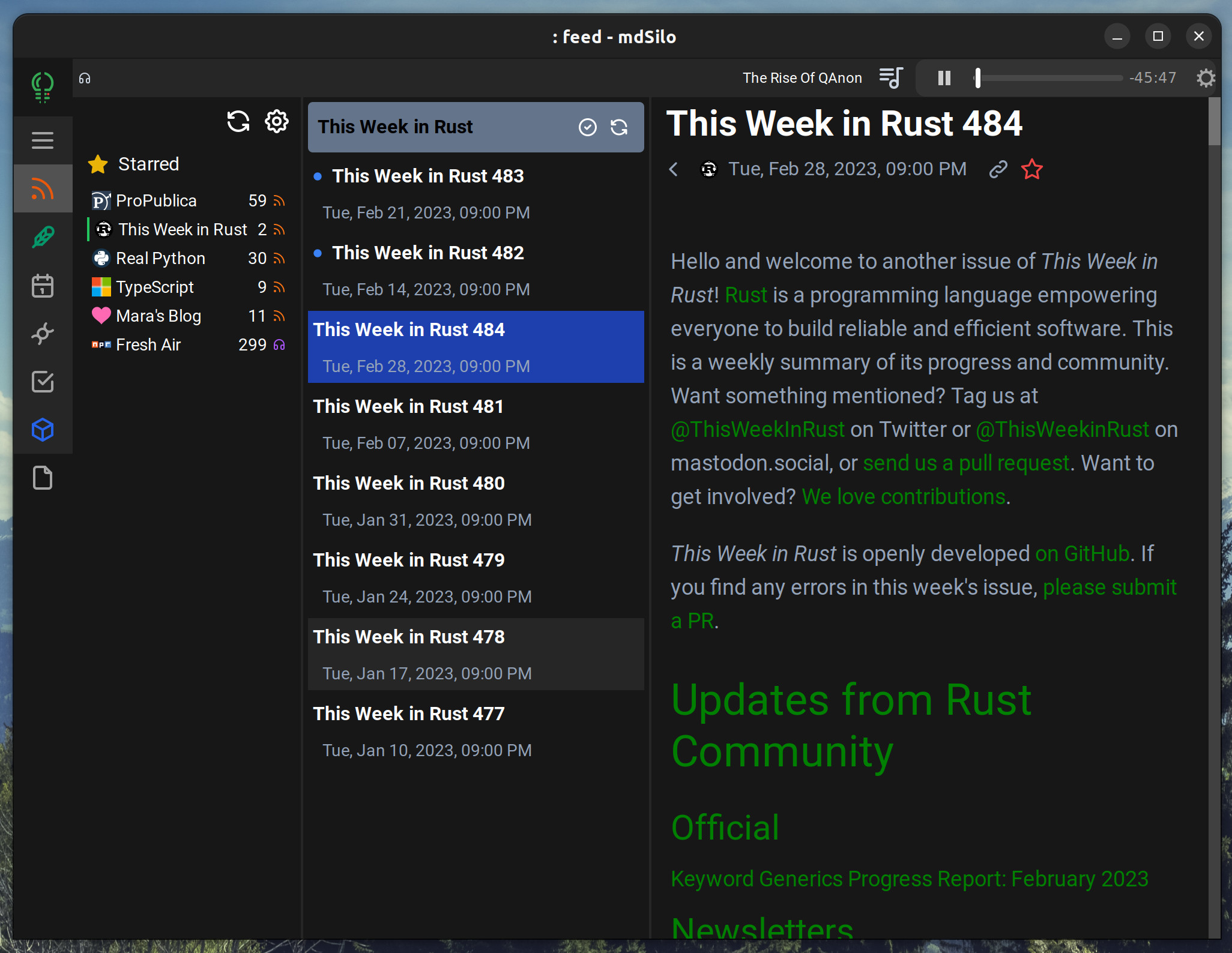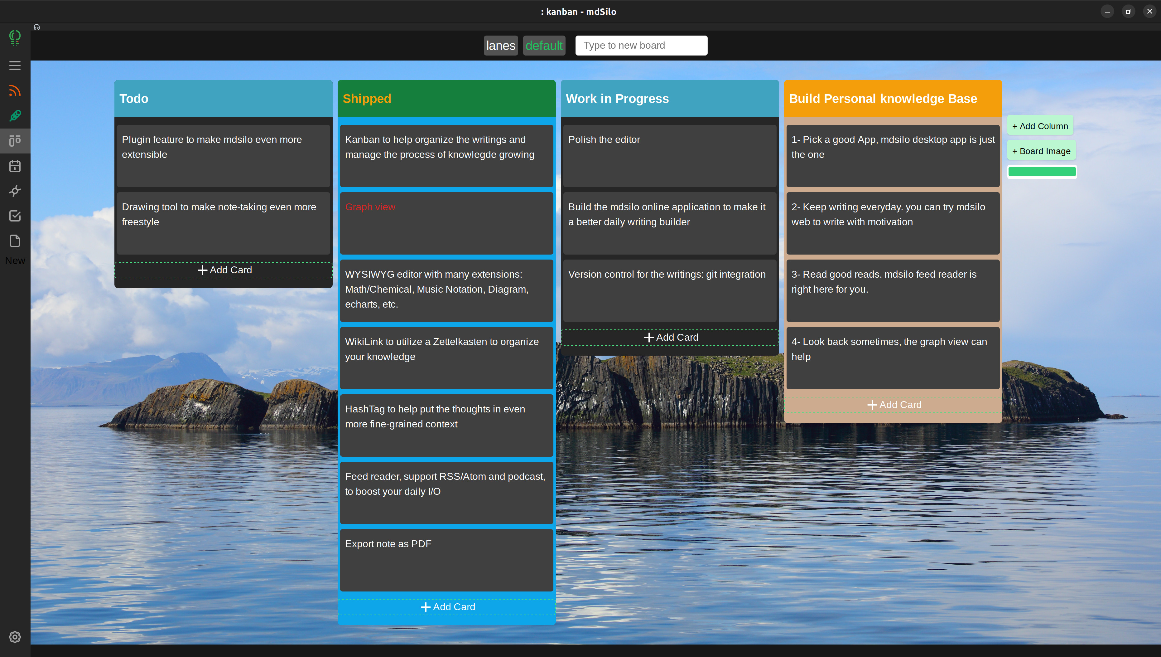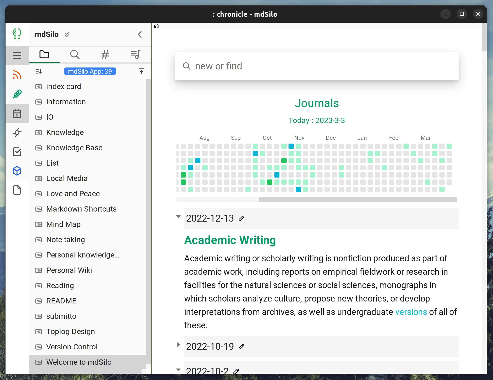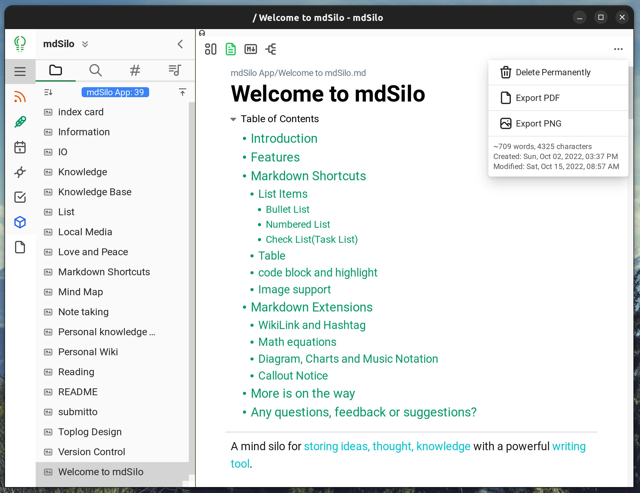 mdSilo je přehledná a nenáročná znalostní báze pro ukládání myšlenek či nápadů a také čtečka RSS nebo Atom zdrojů respektive kanálů. Program nabízí také přehledný all-in-one WYSIWYG editor s podporou Markdown syntaxe.