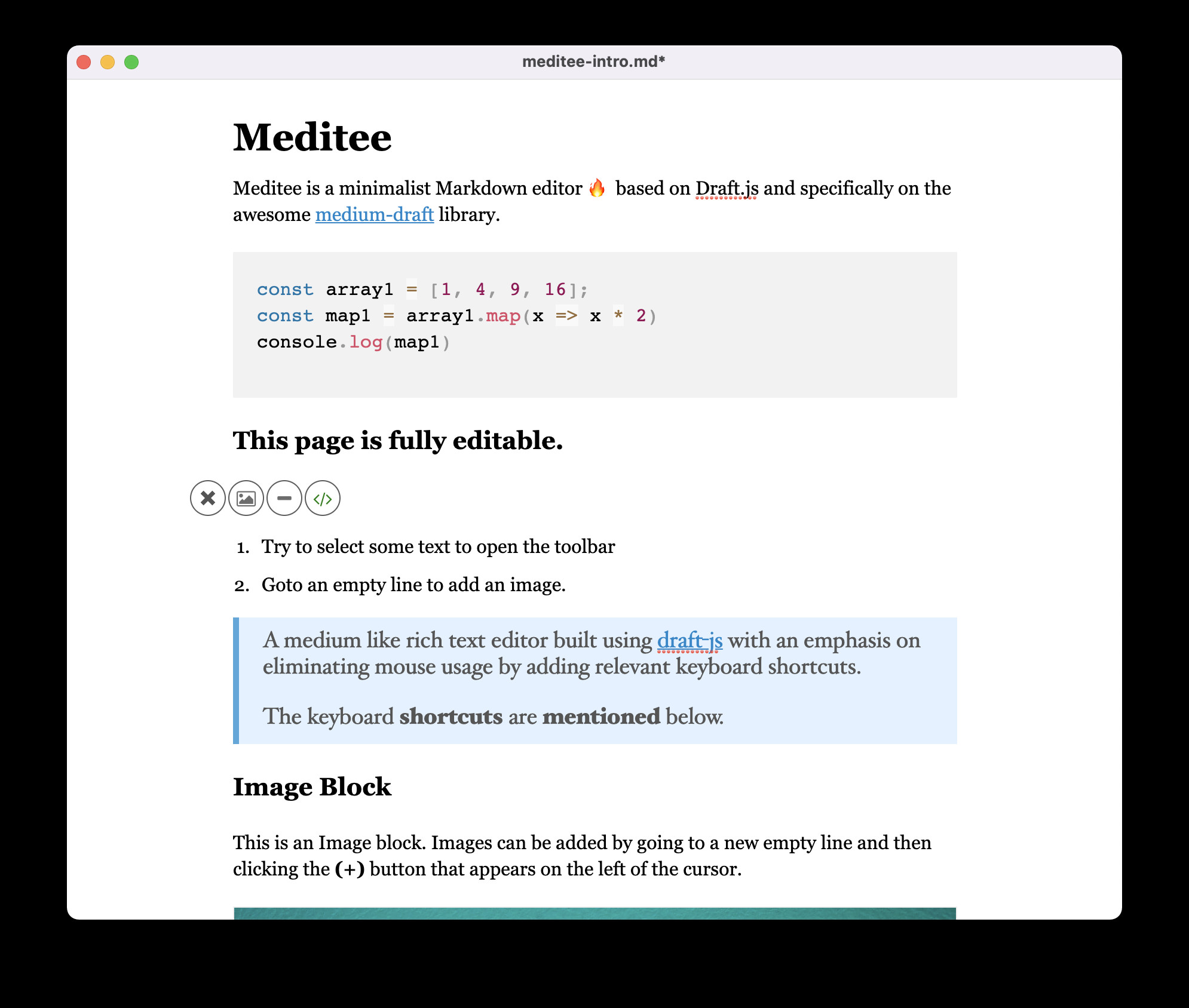 Meditee je přehledný a nenáročný editor pro tvorbu a úpravu Markdown dokumentů. Kromě klasické formátovaného textu lze do dokumentů vkládat například útržky zdrojového kódu se zvýrazněním syntaxe, bodové seznamy, hypertextové odkazy, citace nebo obrázky. Editor Meditee je postaven na softwarových technologiích Draft.js a Electron.