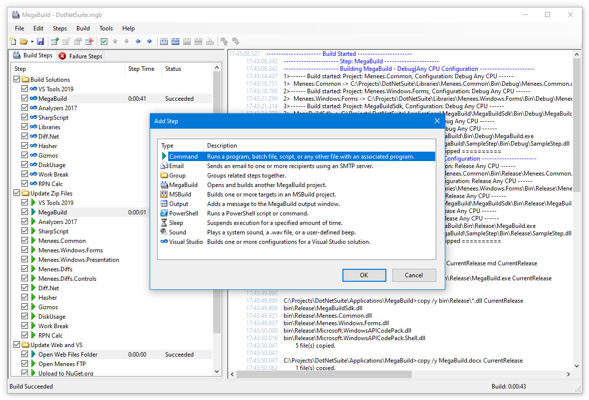 MegaBuild je nástroj sloužící pro automatizaci sestavování softwaru, který je primárně určený k sestavování více řešení ve Visual Studiu (verze 2002-2022). Program také zahrnuje kroky pro spouštění dávkových souborů, PowerShell skriptů, sestavování projektů MSBuild, odesílání e-mailů, přidávání výstupů, čekání po stanovenou dobu nebo přehrávání zvuků.