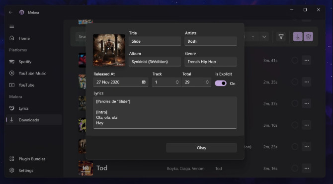 Melora je nástroj sloužící pro snadné a pohodlné stahování hudby z velkého množství různých online serverů či platforem s využitím vlastních plug-inů. Uživatel si může sám zvolit, která metadata chce u audio souborů ponechat. Program využívá volně šiřitelný nástroj ffmpeg, ke kterému je potřeba nastavit cestu.