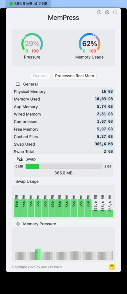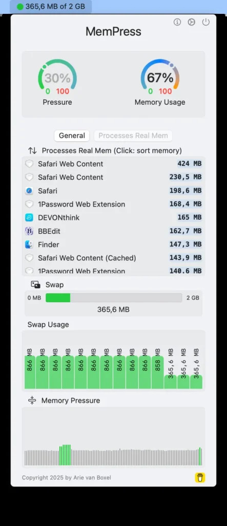 MemPress for Mac je nástroj, který v oblasti menu baru přehledně zobrazuje aktuální využití RAM v počítačích s macOS bez potřeby otevírání Activity Monitoru. Nástroj sleduje využití swap paměti, memory pressure a procento využití RAM. K dispozici je také přehled využití různých typů paměti. Zobrazuje rovněž reálné využití paměti jednotlivými procesy a nechybí přehledné interaktivní grafy.