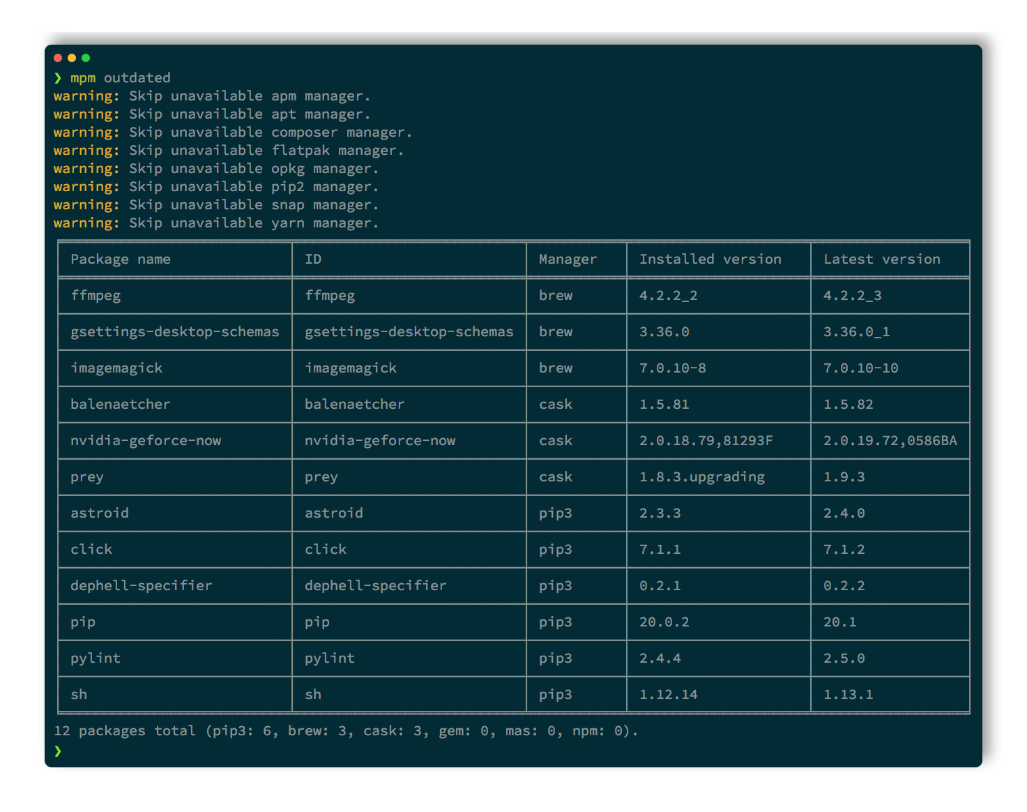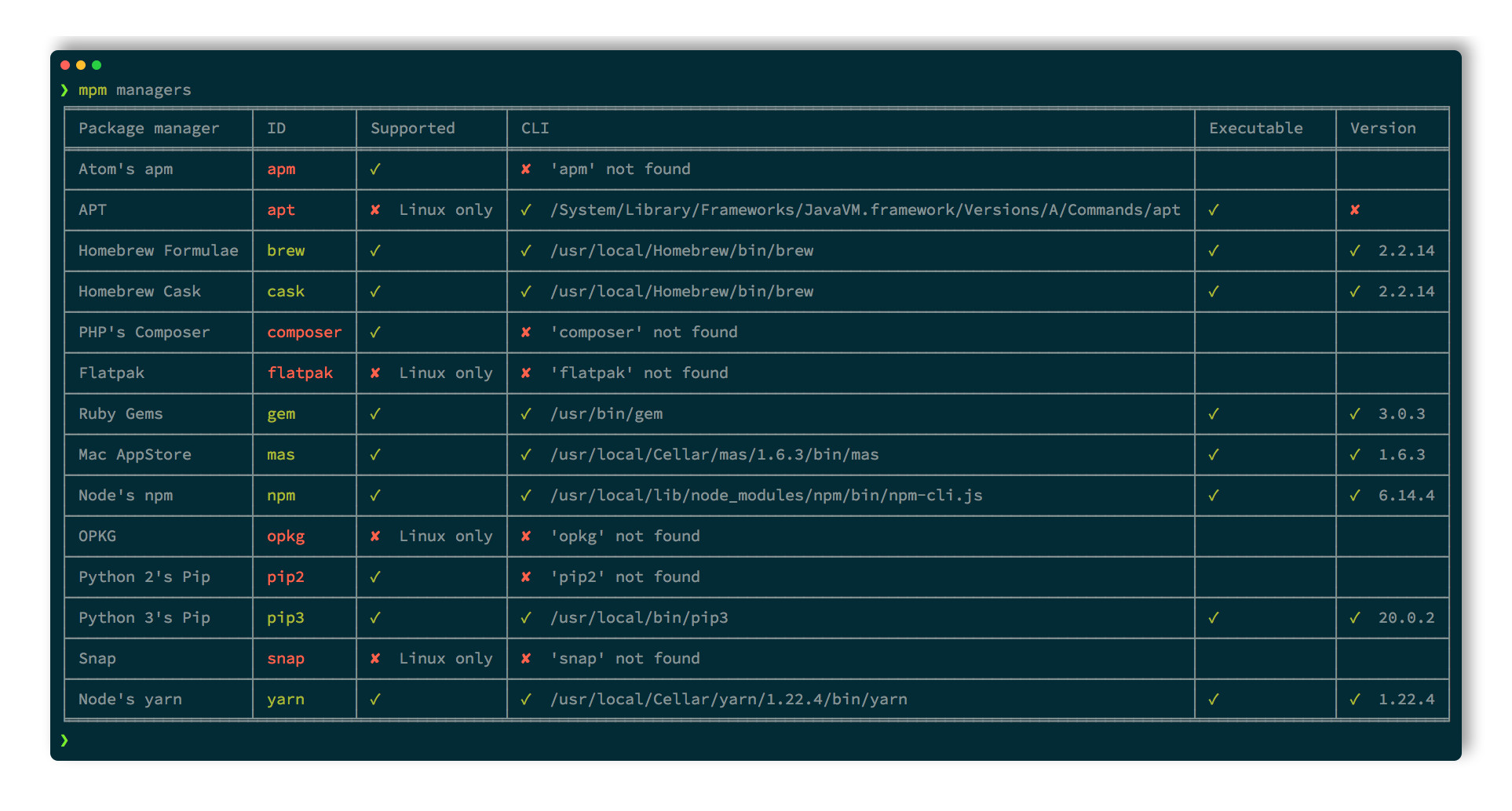 Meta Package Manager je nástroj ovládaný pomocí příkazového řádku, který slouží pro komplexní práci s instalačními balíčky ze všech ostatních správců balíčků. Program umožňuje umožňuje identifikovat a vypsat všechny správce balíčků v systému.