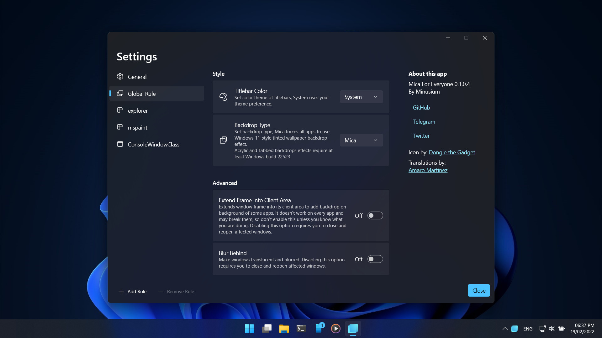 Mica for Everyone! je jednoduchý nástroj, pro aktivaci a zobrazení vizuálního efektu "Mica" i dalších podobných efektů na pozadí operačního systému Windows 11. V programu lze poměrně detailně nastavit vzhled a chování efektu na pracovní ploše.