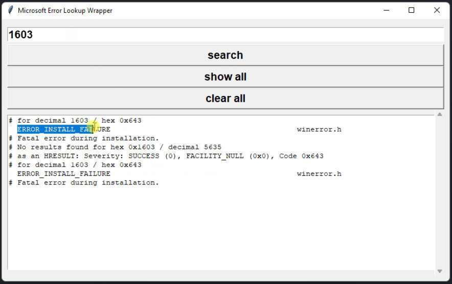 Microsoft Error Lookup Wrapper je grafické rozhraní systémového nástroje Microsoft Error Lookup, který slouží k dekódování chybových kódů. Takovýchto kódu je více než 25 tisíc a někdy je složité přesně identifikovat konkrétní problém. Chybový kód lze zadat jako HEX hodnotu, celou nebo jen vybranou část kódu a program pak zobrazí podrobný popis chyby. Možný je rovněž export všech známých kódů do CSV souboru.