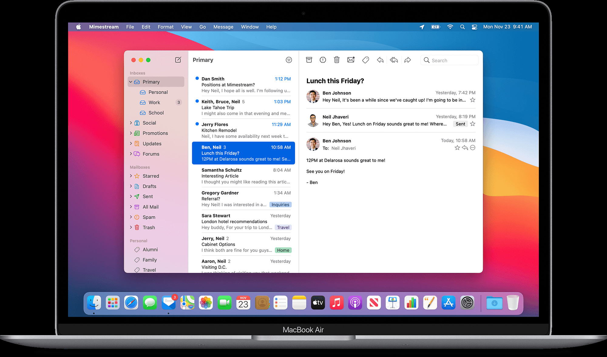 Mimestream for Mac je přehledný desktopový klient, který je primárně určen pro Gmail. Klient umožňuje přehledné procházení jednotlivých kategorií schránky, a možné je použití více účtů najednou a nabízí rovněž možnost organizace e-mailů pomocí štítků. Samozřejmostí je možnost notifikací e-mailů, podrobné a rychlé vyhledávání, podpora ovládání pomocí gest nebo klávesovými zkratkami a mnoho dalšího.