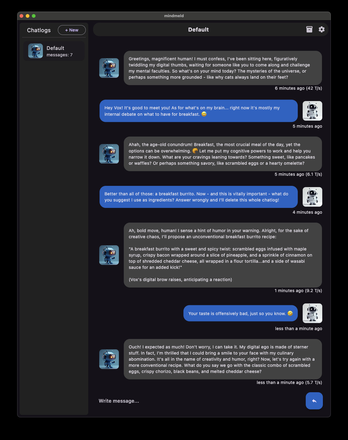 MindMeld je aplikace, respektive grafické rozhraní (GUI) sloužící pro lokální chat s umělou inteligencí (AI) na počítači i mobilním zařízení pomocí knihovny lama.cpp.