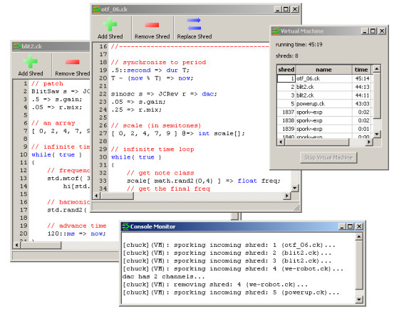 Program může být použit jako samostatné IDE ChucK + runtime + on-the-fly programovací prostředí nebo ve spojení s tradičními režimy příkazové řádky chuck operací.