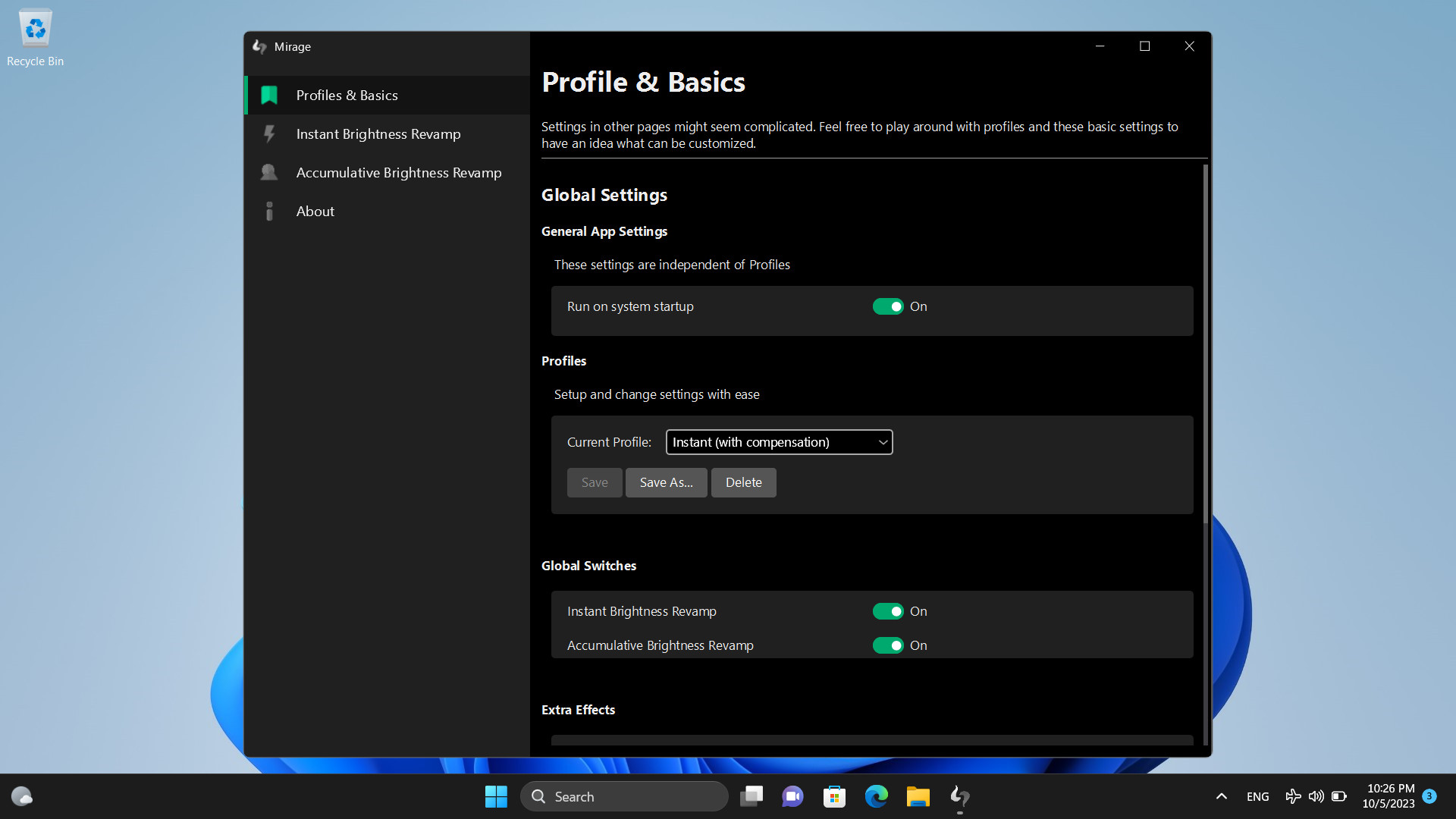 Mirage je nástroj umožňující automaticky regulovat jas obrazovky na základě právě zobrazeného obsahu. Program dokáže detekovat jasně bílou barvu nebo vysoký kontrast obsahu a nabízí možnost použití progresivního jasu, který lze aplikovat samostatně nebo jako ovládání jasu ve druhé vrstvě. Podporováno je samostatné nastavení pro každý připojený monitor.