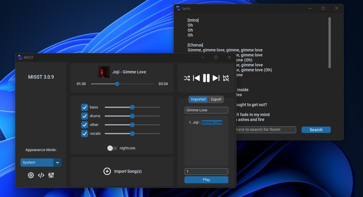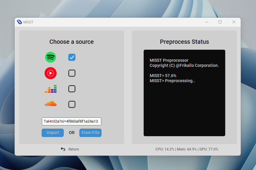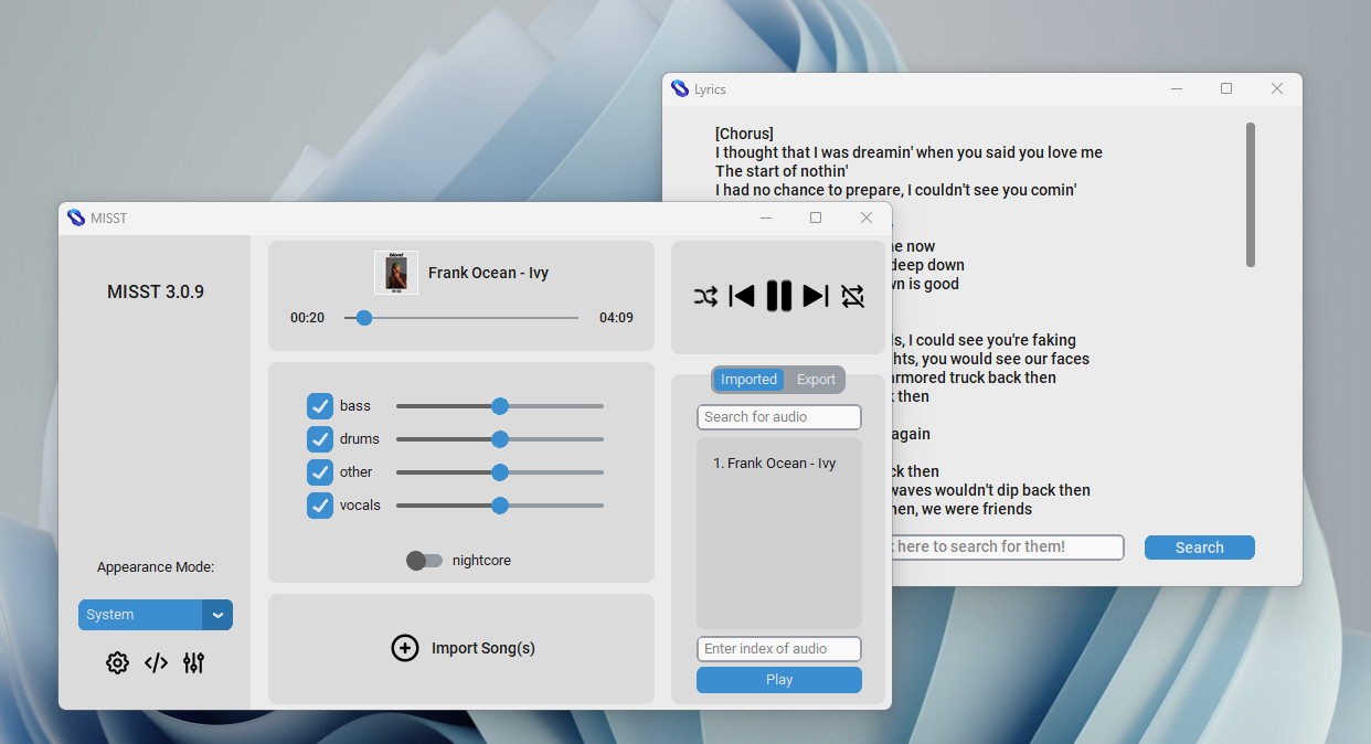 MISST je aplikace sloužící pro extrakci respektive oddělení čtyř základní složek audio souborů. Jedná se o zpěv, basu, bicí a ostatní instrumenty. Při přehrávání zvoleného hudebního souboru program tyto části ukládá do samostatných souborů a kromě toho lze i zobrazovat texty a metadata u jednotlivých skladeb.