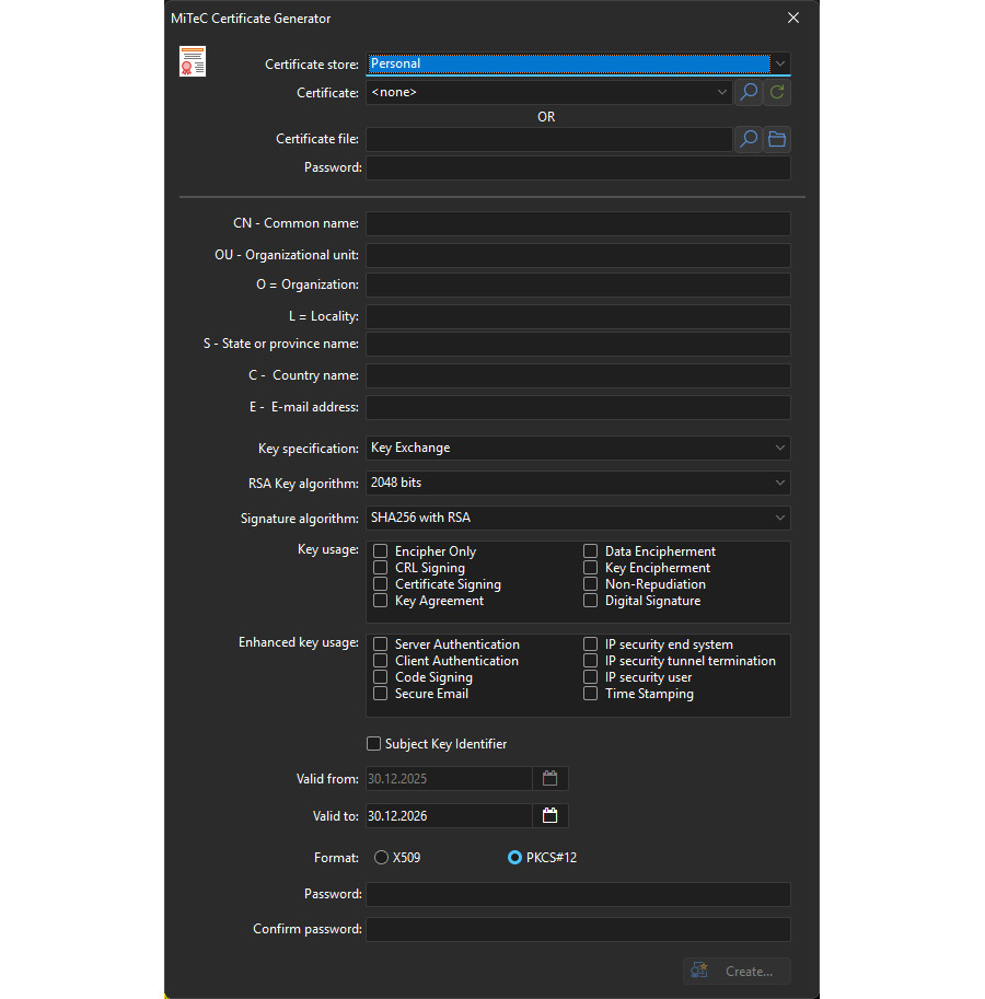 MiTeC Certificate Generator je nenáročný nástroj určený pro generování digitálních "self-figned" certifikátů ve formátech X509 (pem,cer) nebo PKCS#12 (pfx). Generovány jsou certifikáty založené na 1024 nebo 2048 bitových RSA klíčích. Vygenerován je pár veřejného a privátního klíče a výsledný certifikát se ukládá přímo do souboru, který lze následně importovat do Windows Certificate Store. Program není potřeba instalovat.