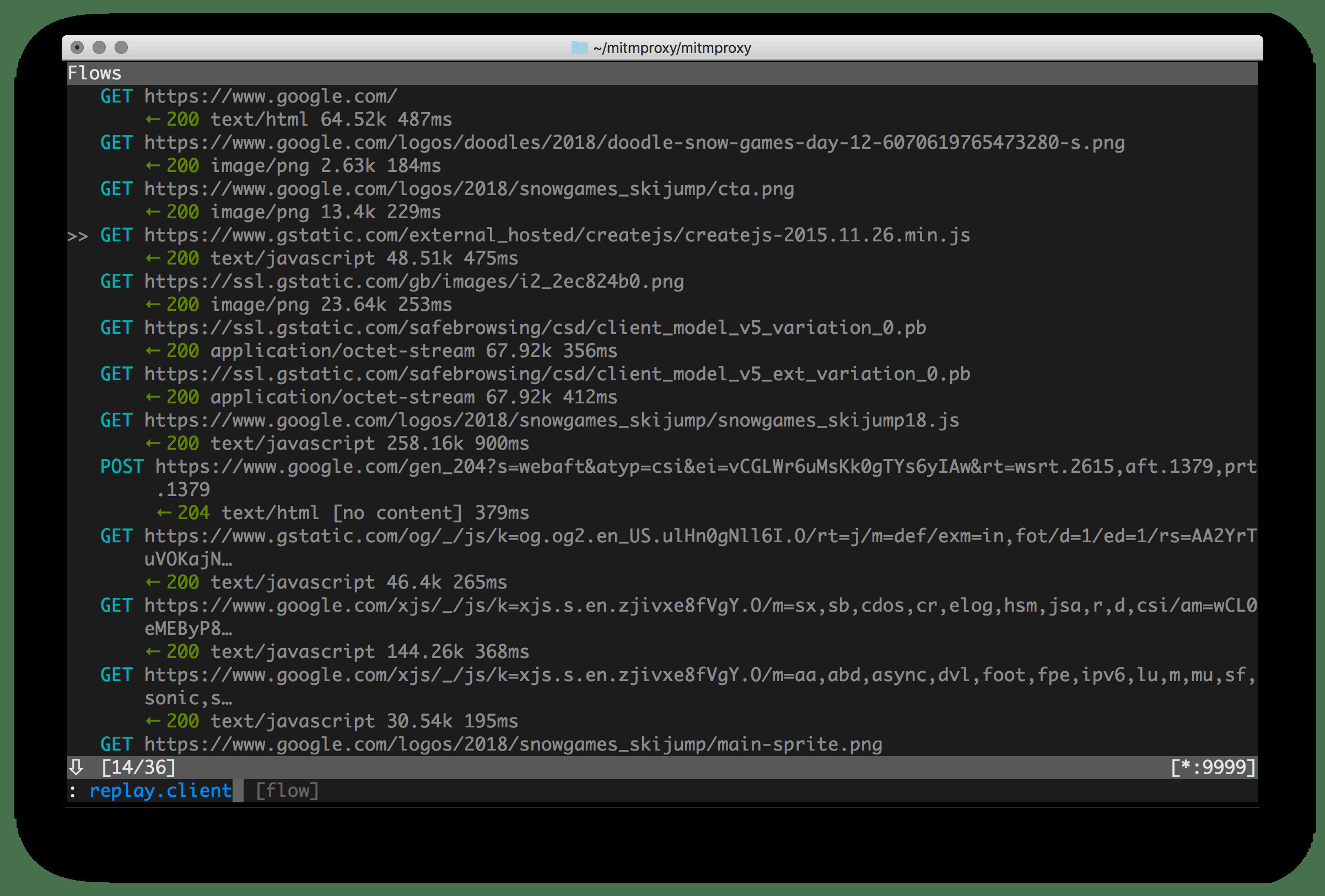 mitmproxy je nástroj sloužící jako interaktivní HTTPS proxy serve pro detailní analýzu síťového provozu pro testery či vývojáře. Nástroj dokáže zachytávat, číst, upravovat a přehrávat provoz HTTP/1, HTTP/2, HTTP/3, WebSocket a dalších SSL/TLS protokolů, včetně dekódování formátů jako HTML či Protobuf.