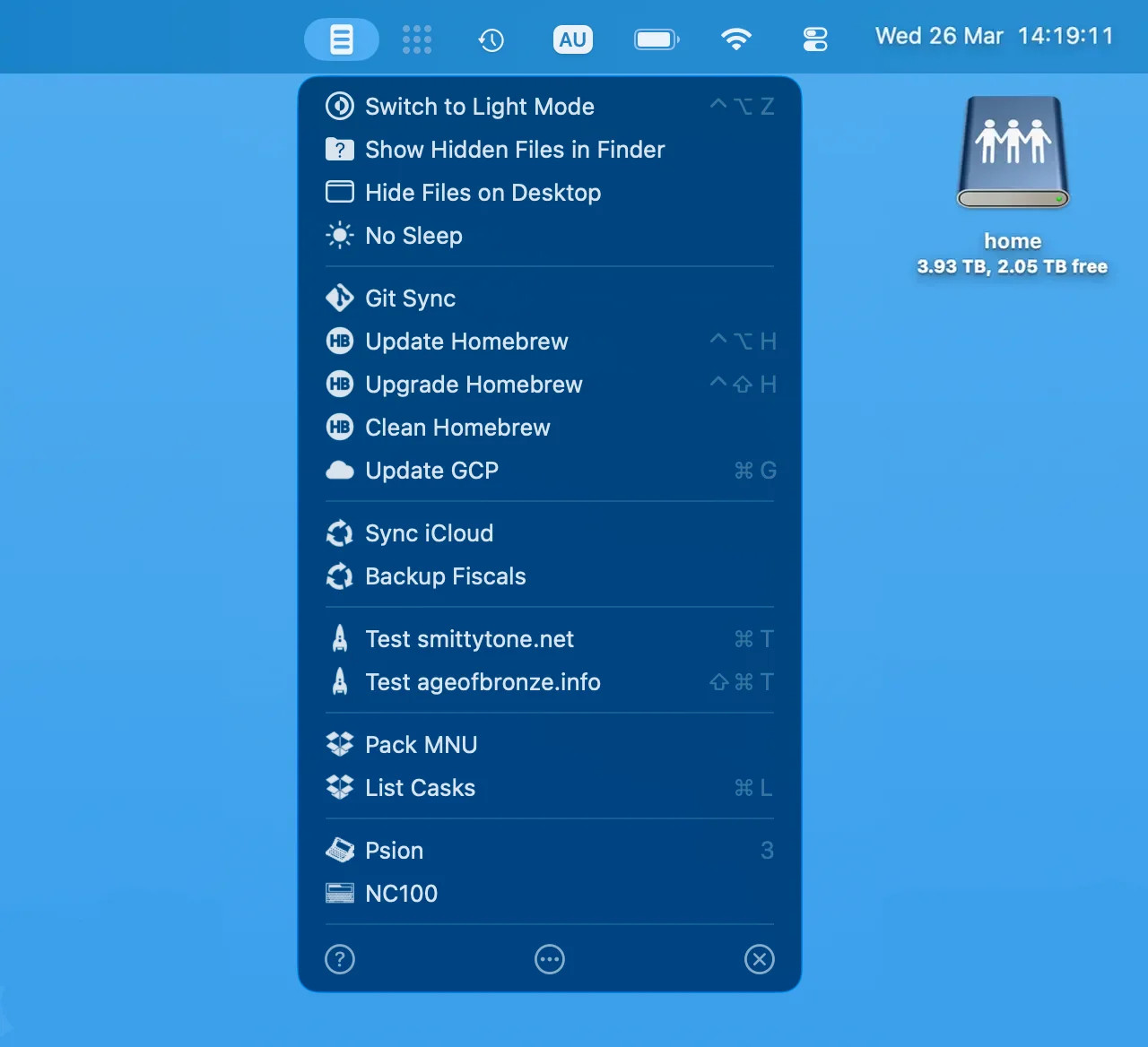 MNU for Mac je pomocník určený pro snadnou správu položek a další nastavení položek v oblasti menu baru v macOS. Nástroj obsahuje skripty pro přípravu grafiky (mnuprep.sh) a pro automatické ukončení běžící instance aplikace po reinstalaci (postinstall.sh).