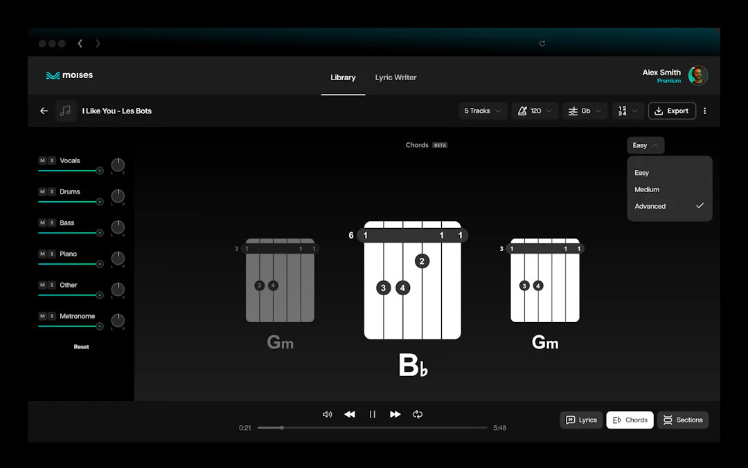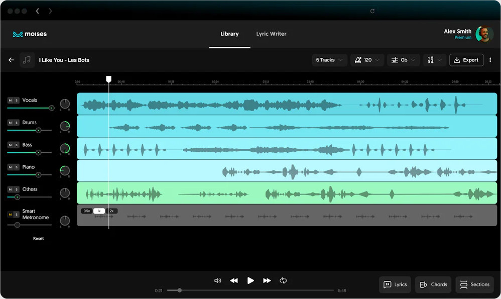 Moises je aplikace je aplikace určená pro amatérské i profesionální hudebníky. Program umožnuje provádět zpracování audio nahrávek s využití AI (umělé inteligence).