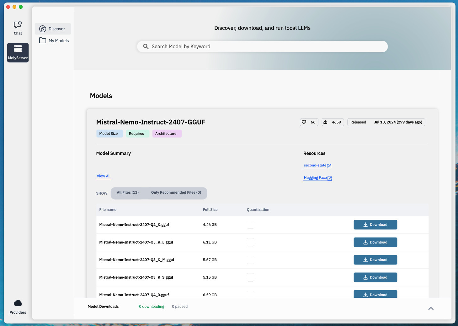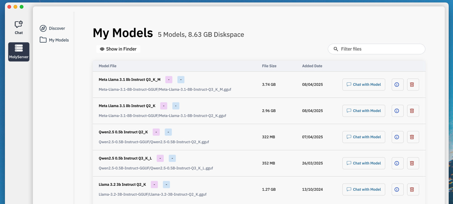 Moly je aplikace určená pro práci s velkými jazykovými LLM modely. Program umožňuje provádět přehlednou správu lokálních i cloudových LLM. Umožňuje také prohledávat, stahovat a spouštět open source modely lokálně, přičemž backend běží přes moly-server s podporou WasmEdge a uživatelské rozhraní je kompatibilní s OpenAI API.