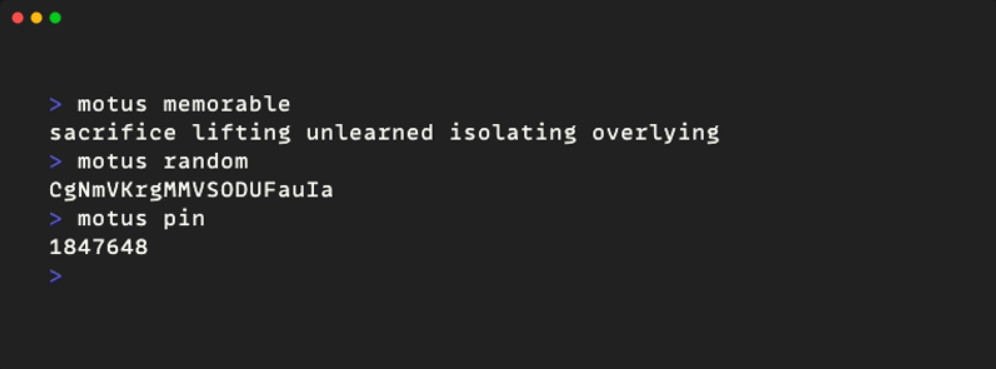 Motus for Mac je nástroj pro macOS ovládaný pomocí příkazového řádku, který slouží pro generování bezpečných náhodných hesel nebo PIN kódů. Program umožňuje tvorbu zapamatovatelných hesel založených na slovníku EFF, náhodných hesel s volitelným zahrnutím číslic a symbolů a číselných PINů s nastavitelnou délkou. Vygenerované heslo lze ihned uložit do systémové schránky. Nástroj lze využít jak v interaktivním režimu, tak ve skriptech.