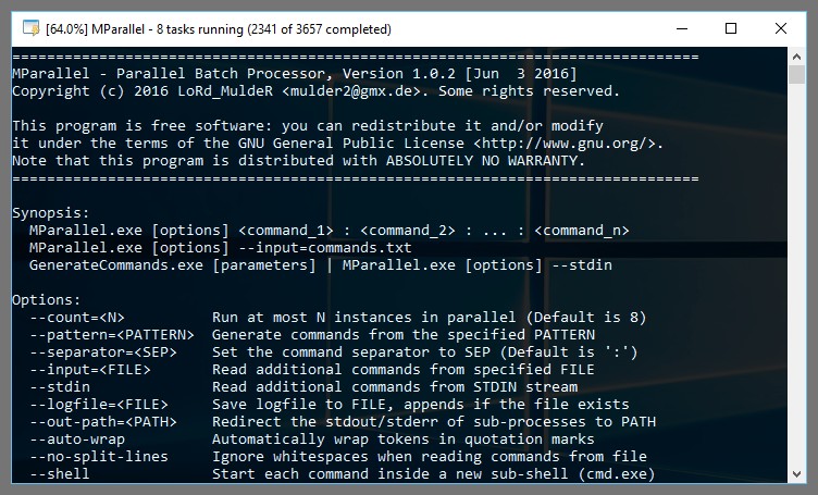 MParallel je dávkový procesor s podporou paralelního zpracování více úloh současně. Program je optimalizován pro více jádrové procesory. Jednotlivé příklady použití a příkazy jsou obsaženy v instalačních archivech.