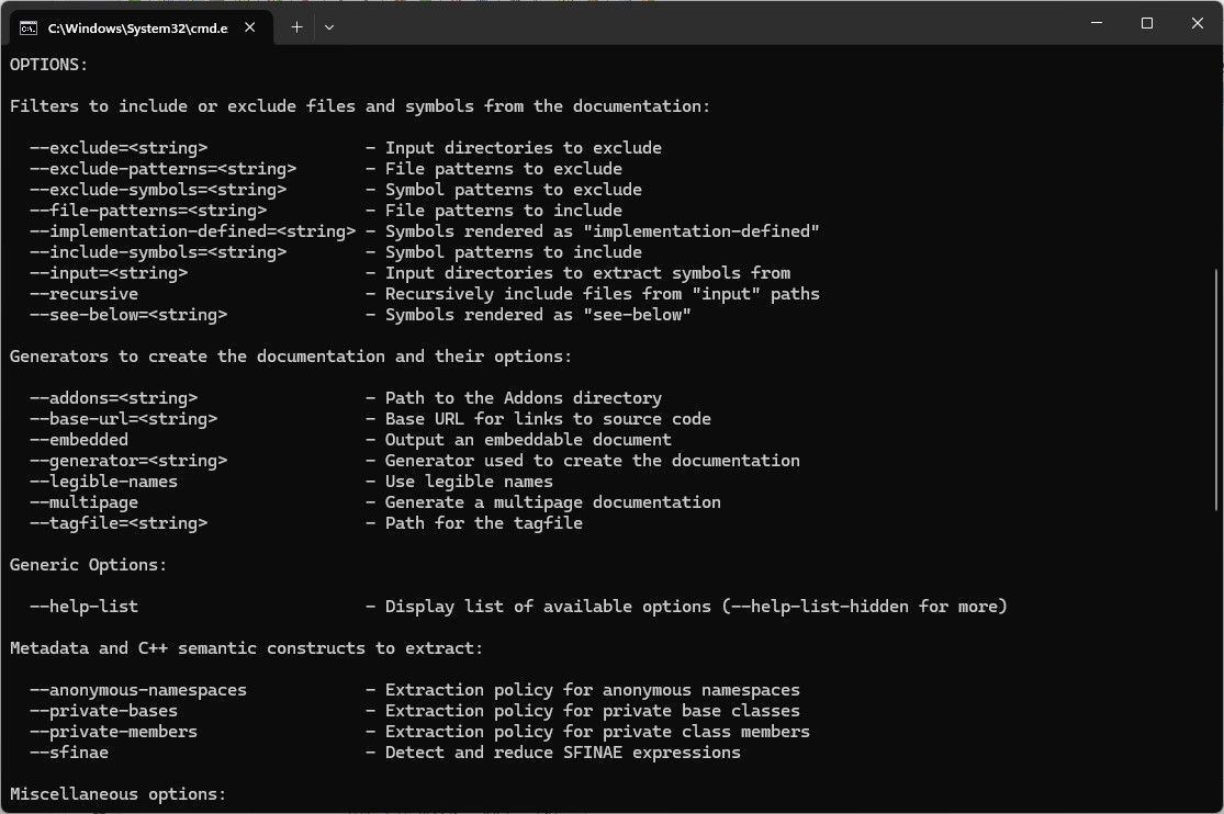 MrDocs rozumí C++ konstrukcím bez potřeby maker, což zajišťuje přesnou a aktuální dokumentaci. Podporovány jsou různé formáty výstupu, jako například Asciidoc, HTML nebo XML.
