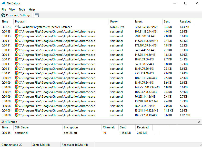 NetDetour je aplikace umožňující integrovat různé proxy protokoly (HTTP, SOCKS4, SOCKS5 nebo SSH) do vybraných aplikací. Uživatel může vytvořit také vlastní pravidla a pro různé proxy a domény.