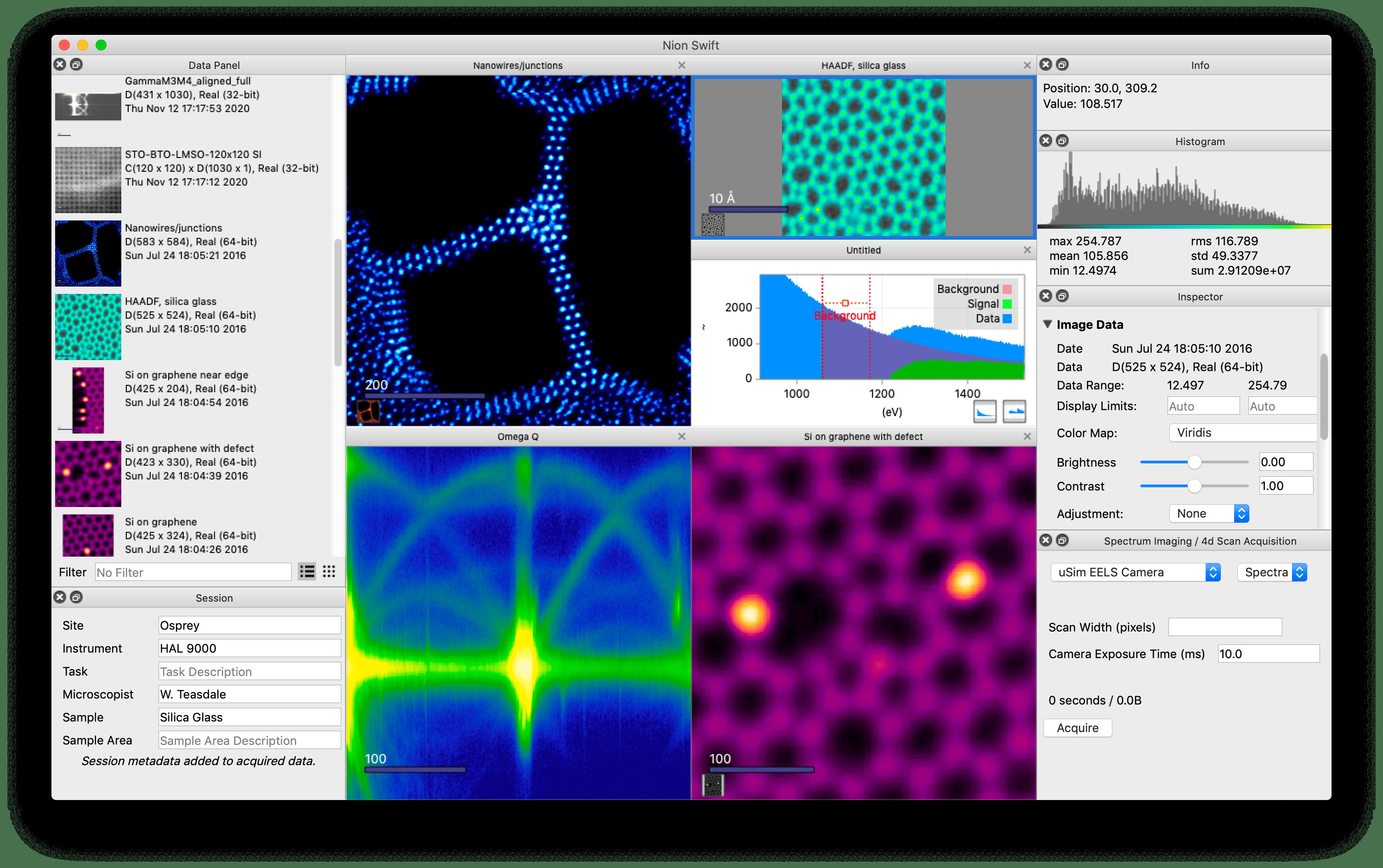 Nion Swift je pokročilý vědecký software pro zpracování obrazu, který pak využívá Python k integraci hardwarového řízení, sběru dat, vizualizace, zpracování a analýzy. Podporovány jsou různé typy dat, včetně obrázků, grafů a vícerozměrných dat. Program také poskytuje živé výpočty aplikované během sběru dat nebo pro úpravu parametrů.